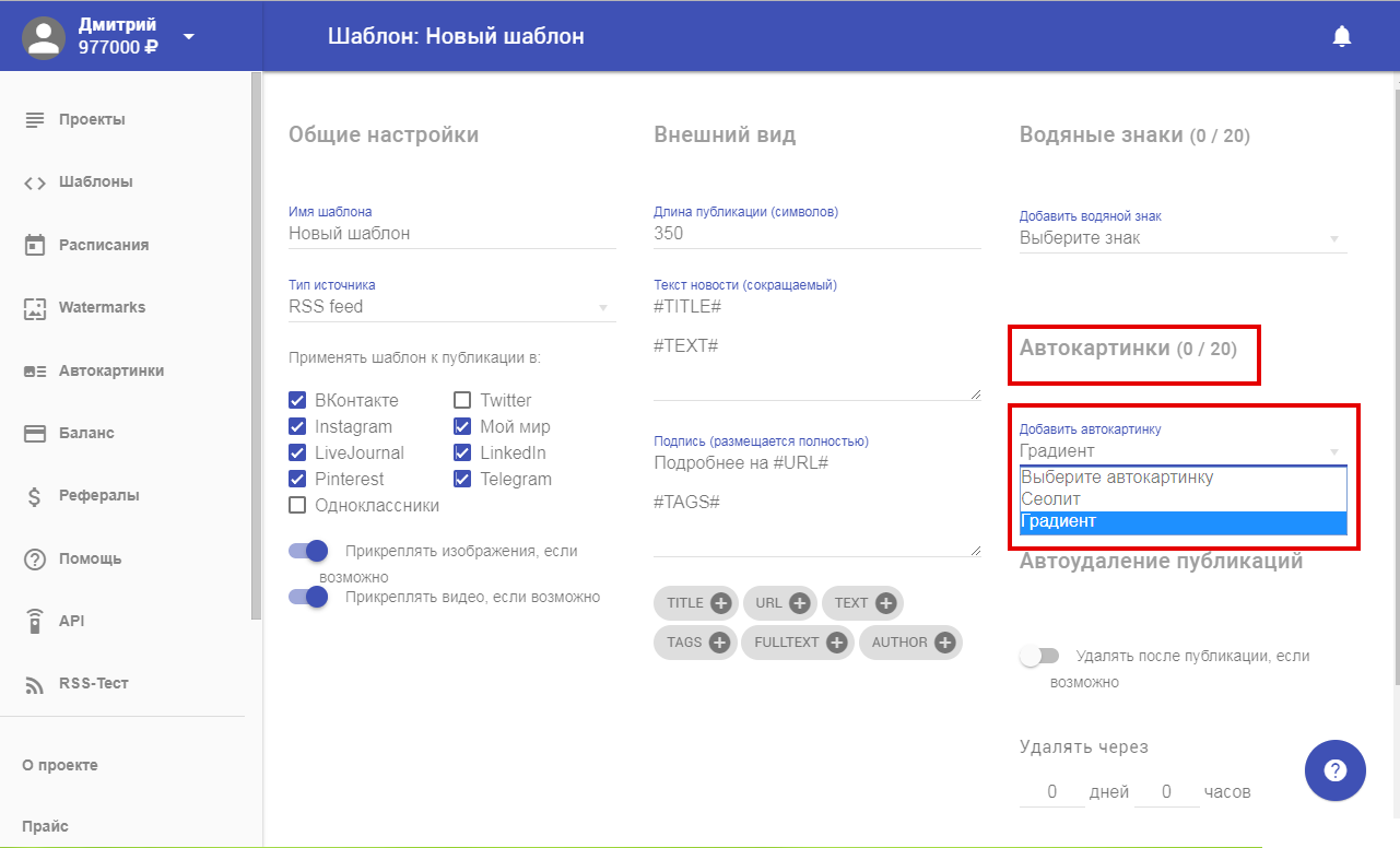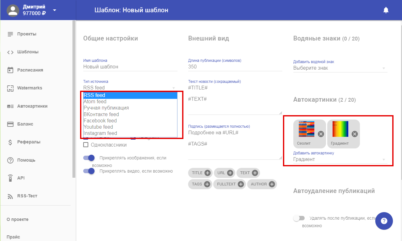 7. Вы можете привязать более одной автокартинки, если это необходимо. Выбирая тип источника, можно сразу привязать автокартинку к нужному источнику публикации.