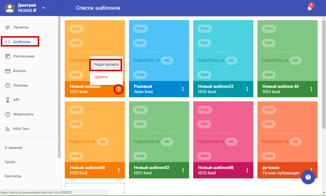 5. Теперь нужно привязать автокартинку знаки к шаблонам публикаций. Для этого перейдите в шаблоны и выберете в нужном шаблоне пункт "Редактировать".