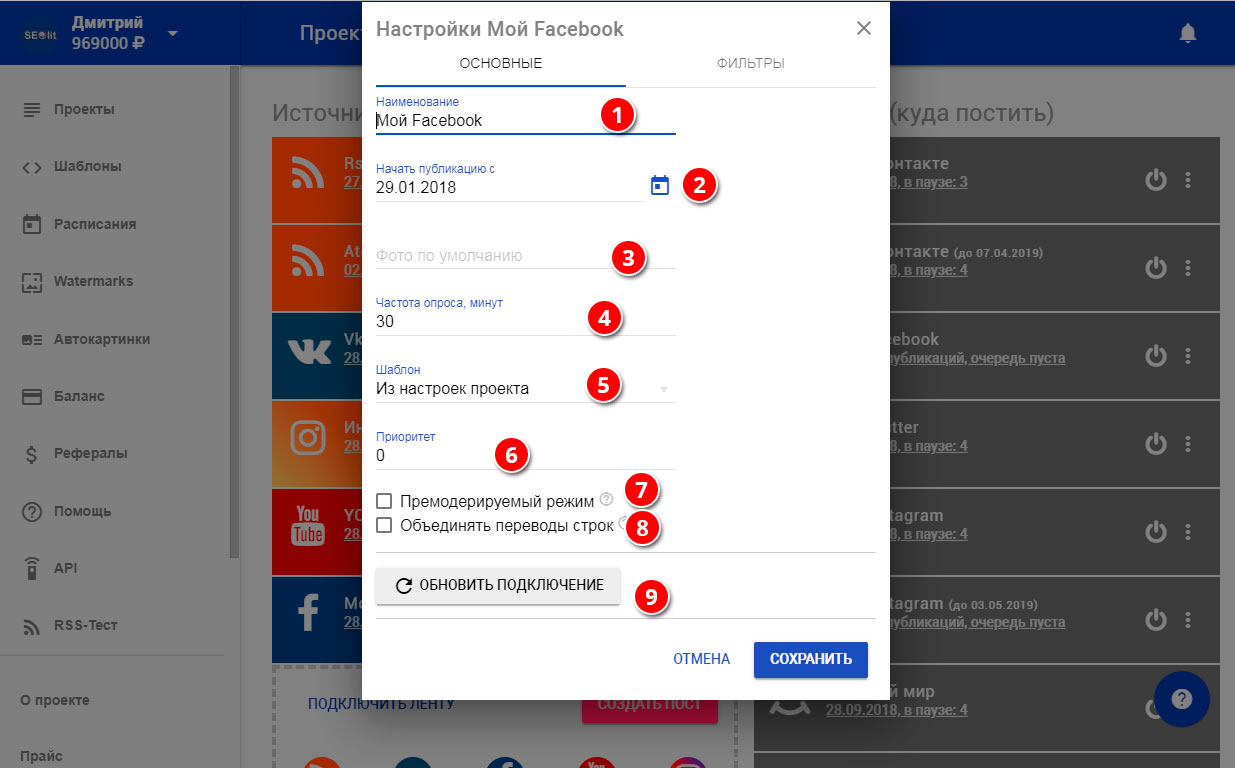 9. Если вдруг ваши публикации перестали считываться, а это можно увидеть проанализировав очередь публикаций, то эта кнопка обновит доступ к вашей ленте для SEOlit. Обычно это случается, когда происходит смена пароля в аккаунте, отключается приложение SEOlit в аккаунте, либо лента, или проект с этой лентой долгое время был отключен. Нажимая эту кнопку Вы можете самостоятельно решить эту проблему.