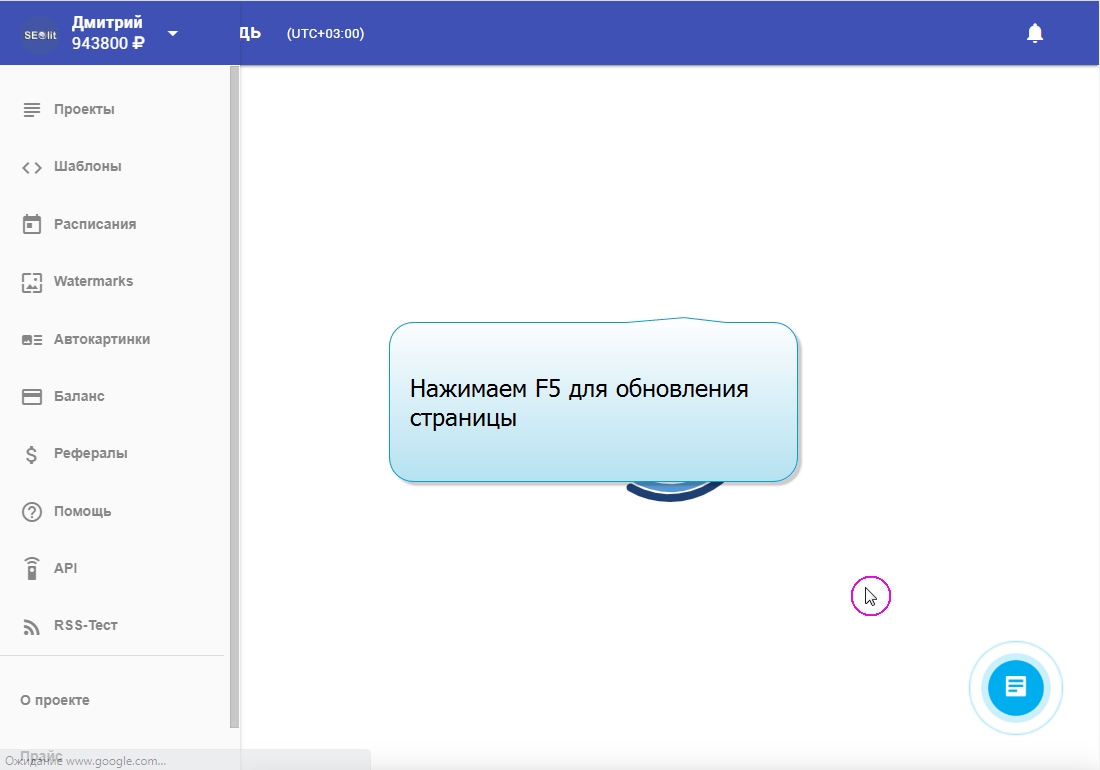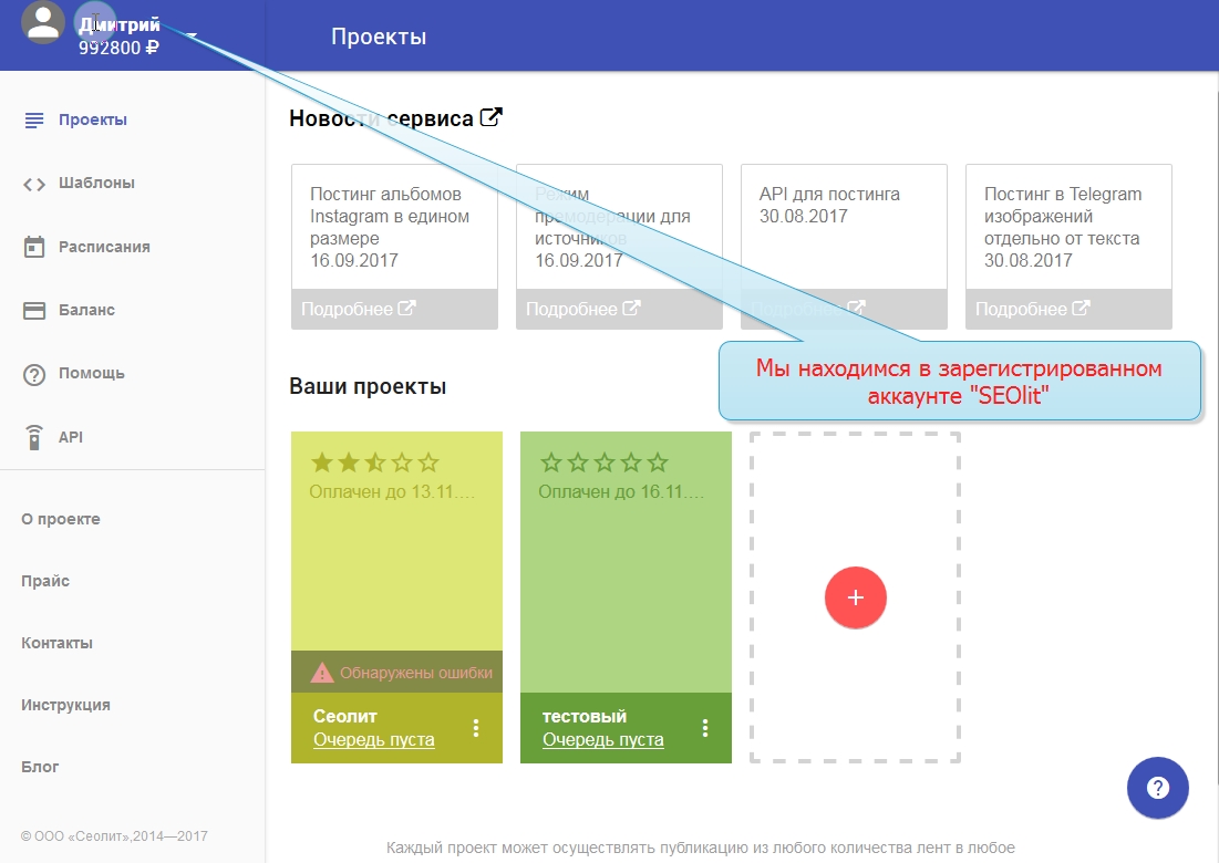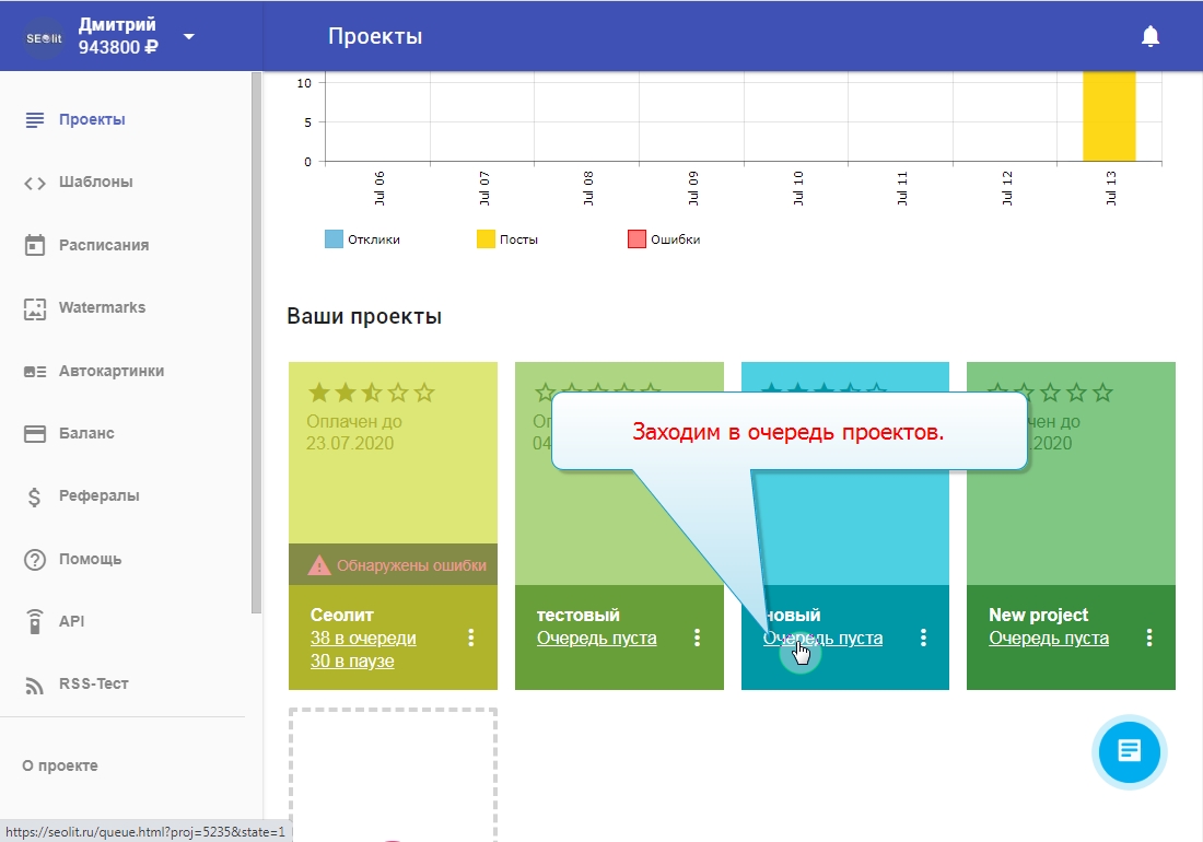 1. Вы вошли в свой профиль в Сеолите и находитесь на стадии выбора проекта.