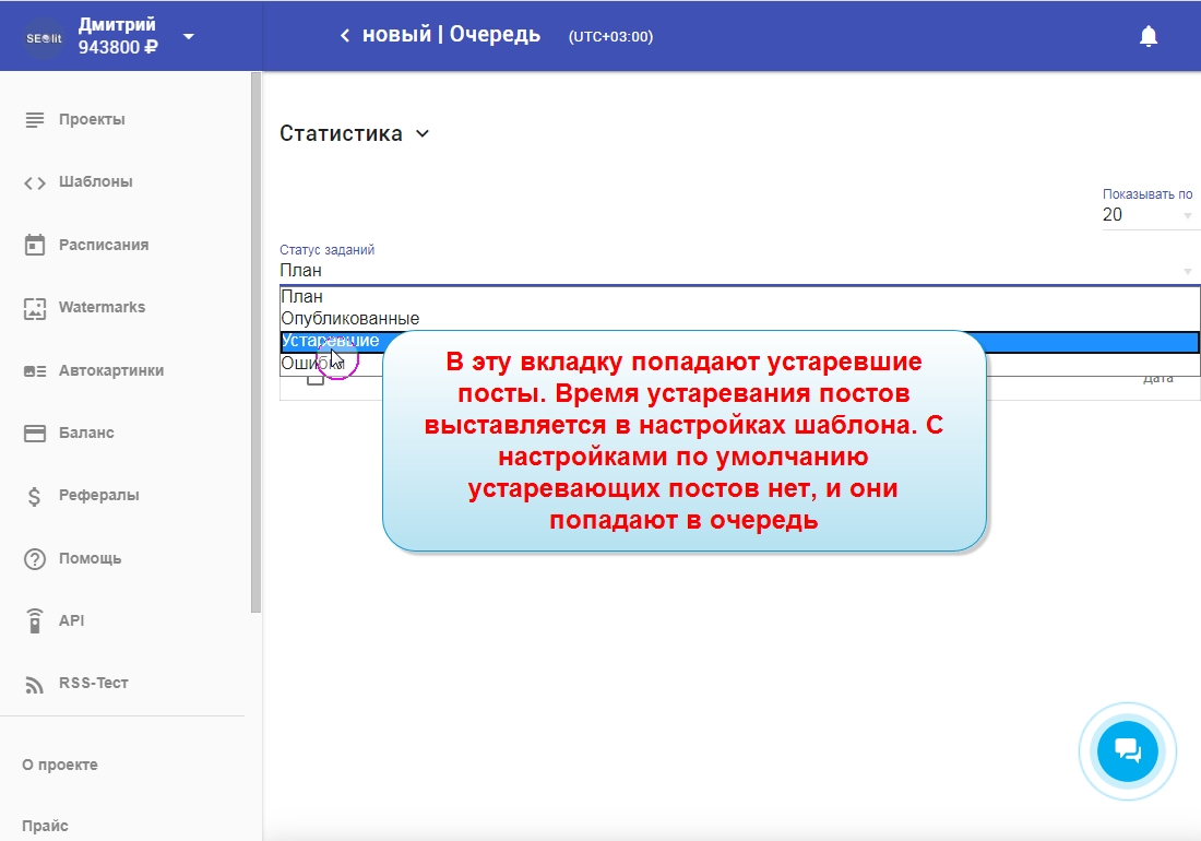 11a. "Устаревшие" - это список публикаций с постами, которые прошли период устаревания, настроенные в шаблоне. С настройками по умолчанию устаревающих постов нет и они все попадают в очередь