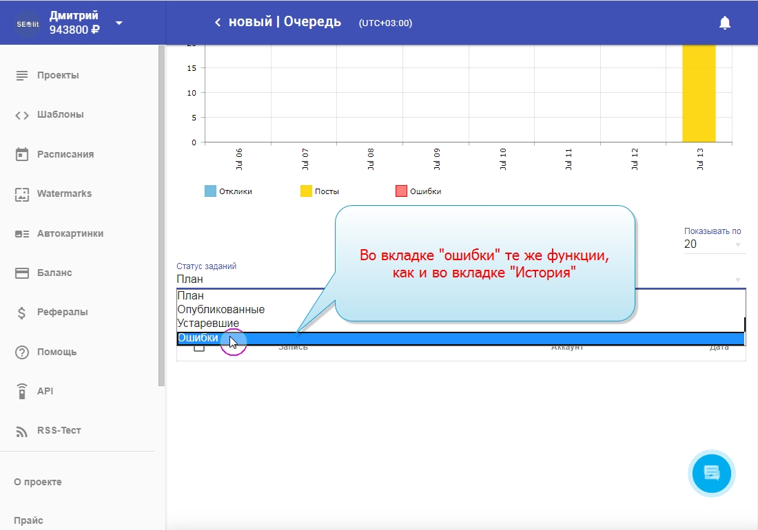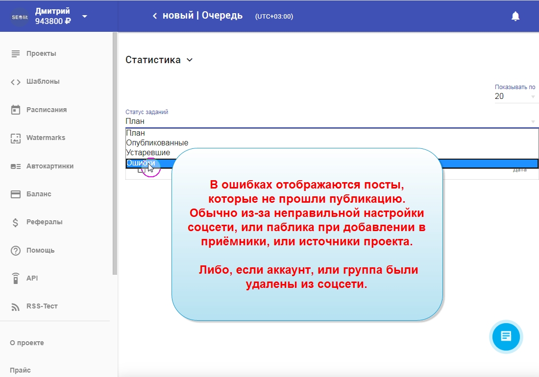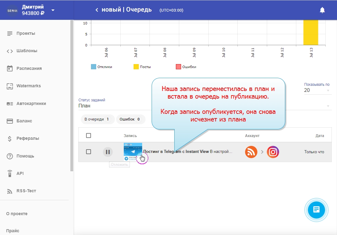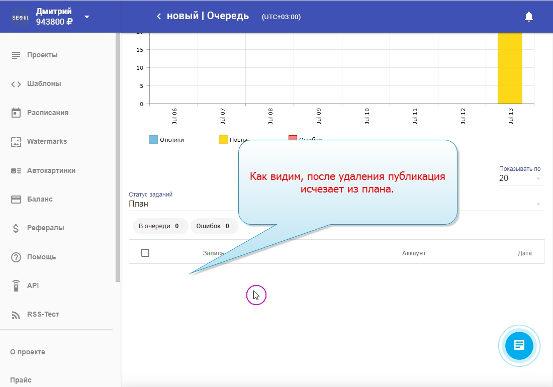 13. Чтобы увидеть в "плане" будующие публикации нужно опубликовать новый пост, или повторить публикацию из вкладок "история" или "ошибки".
