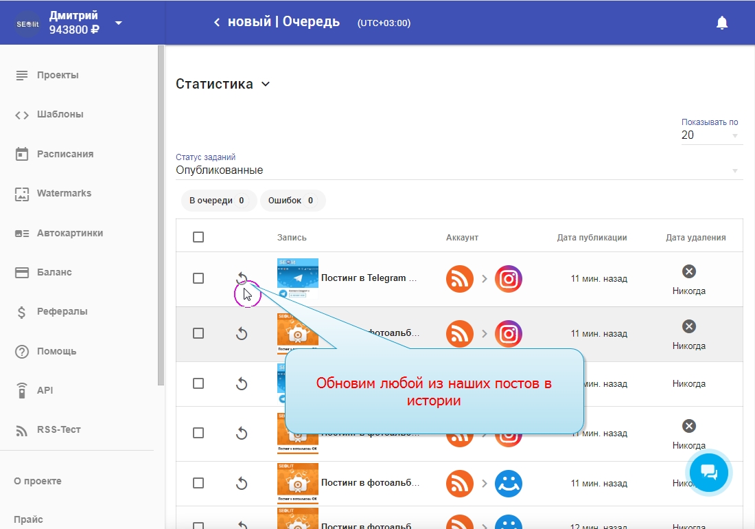 14. Зайдём в историю и нажмём на кнопку "обновить публикацию".