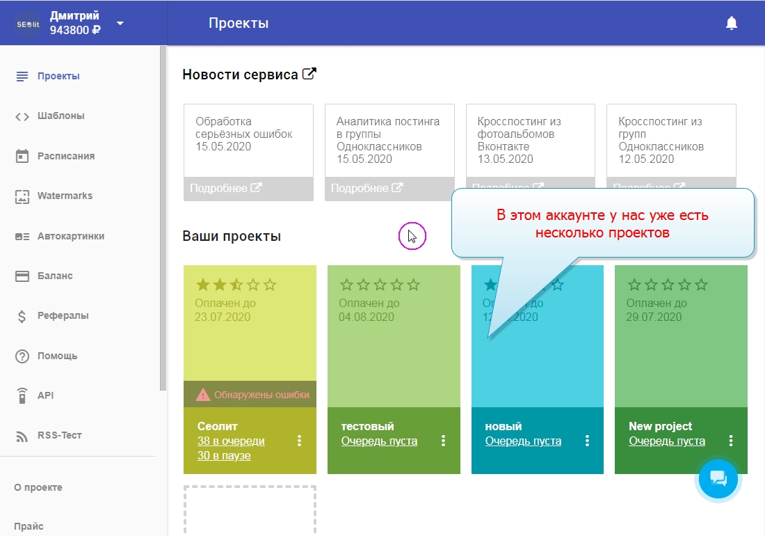 2. В этом аккаунте уже есть предварительно настроенные проекты