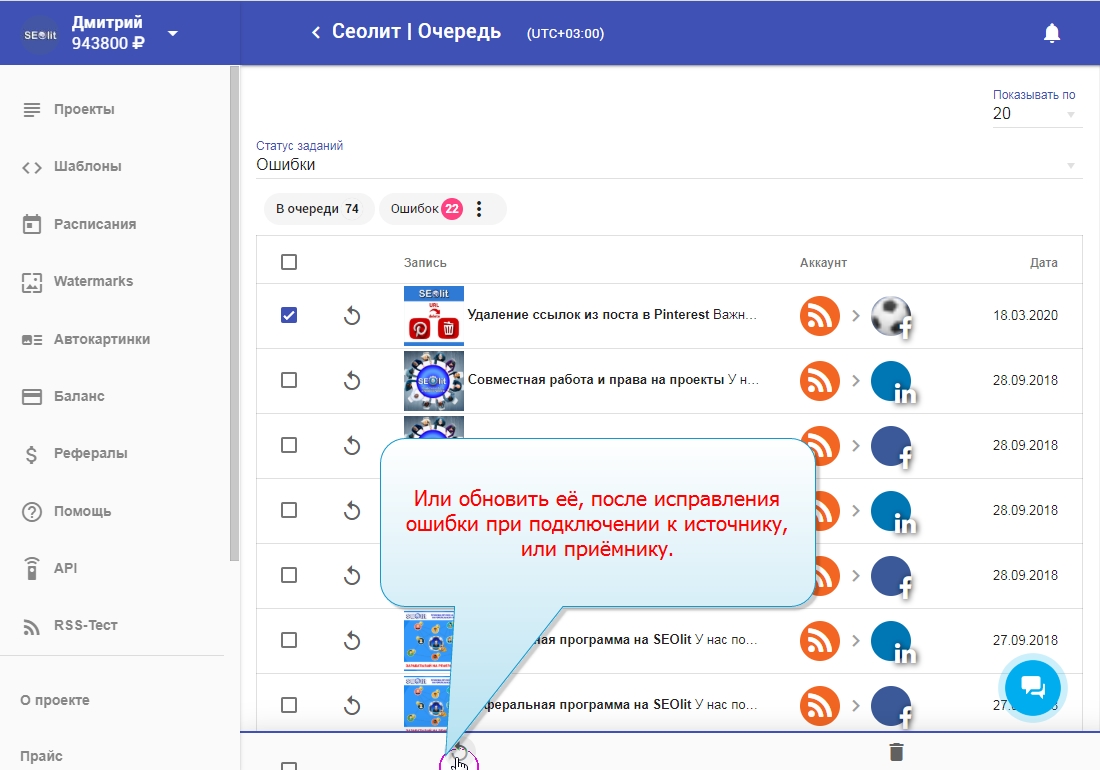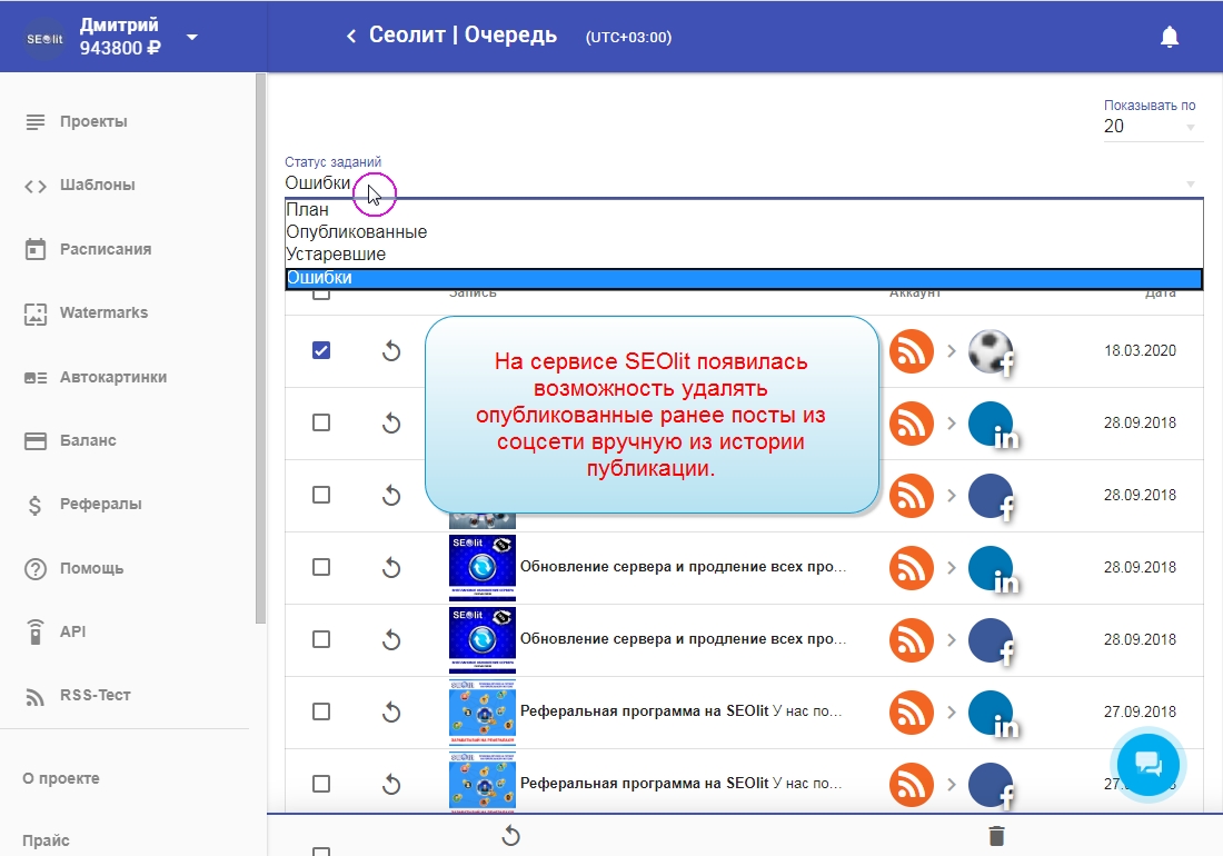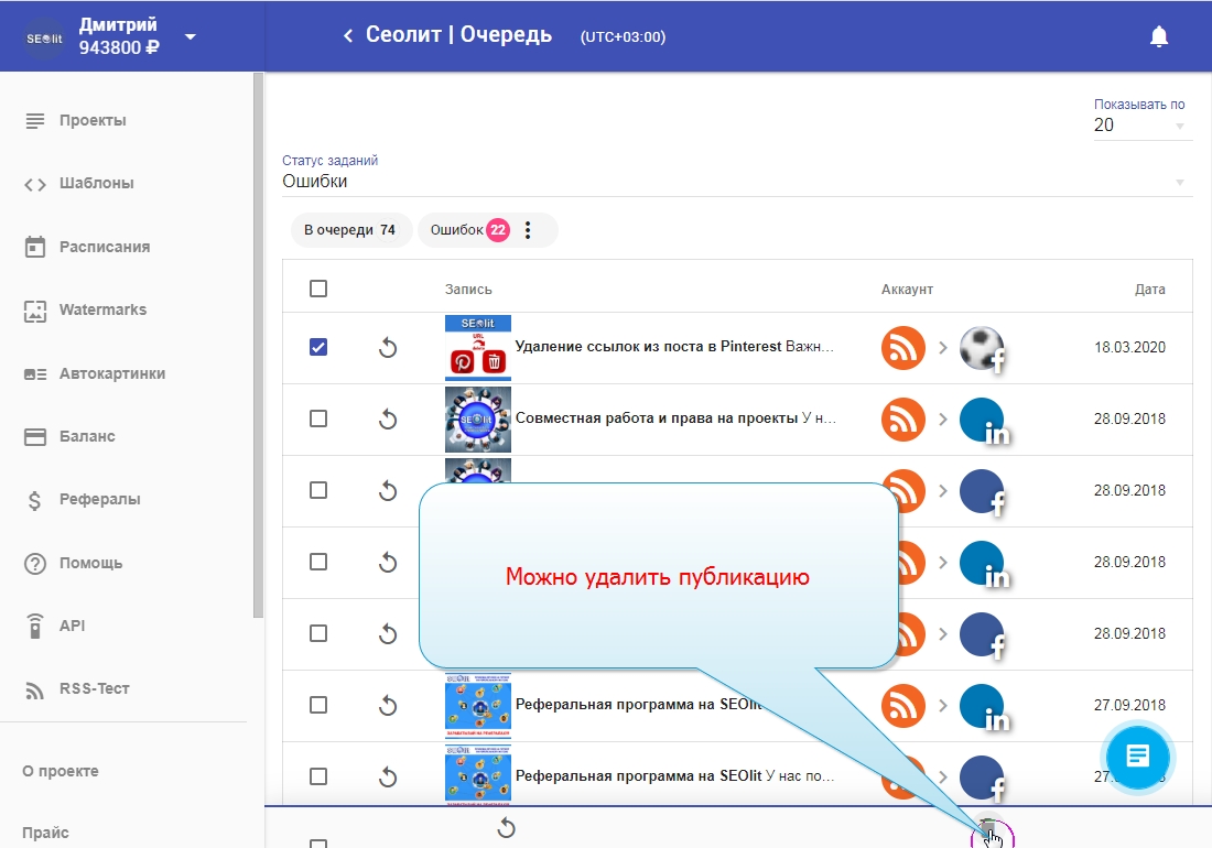 21. Можно удалить публикацию из списка ошибок.