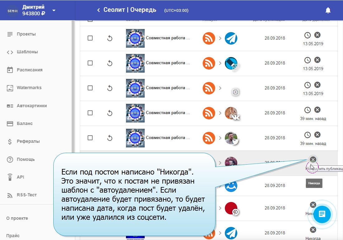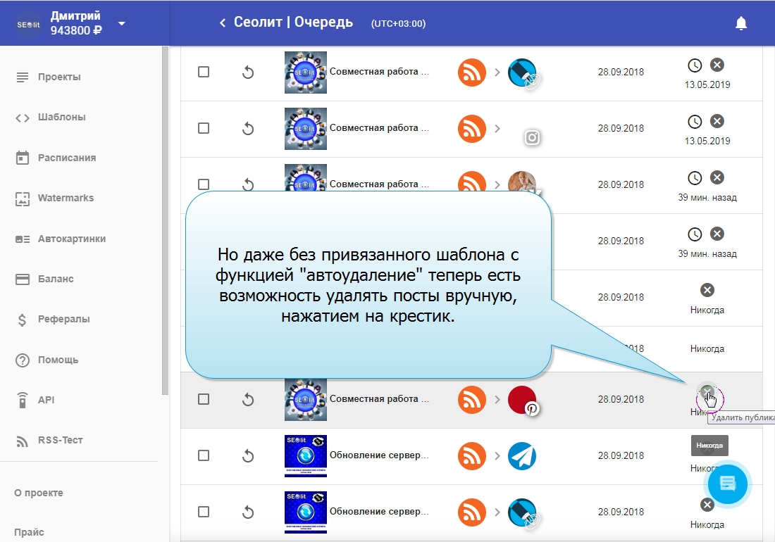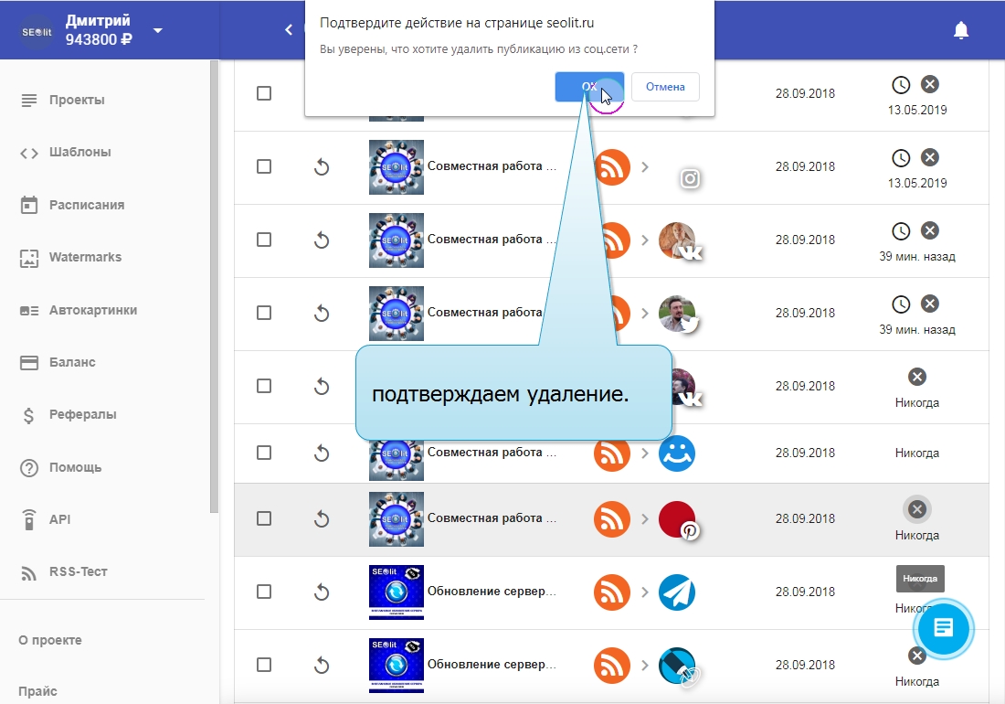 26. Нажимая на крестик, мы можем удалить пост прямо из соцсети, не заходя в неё.