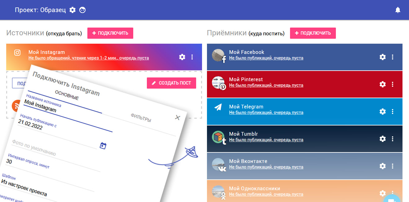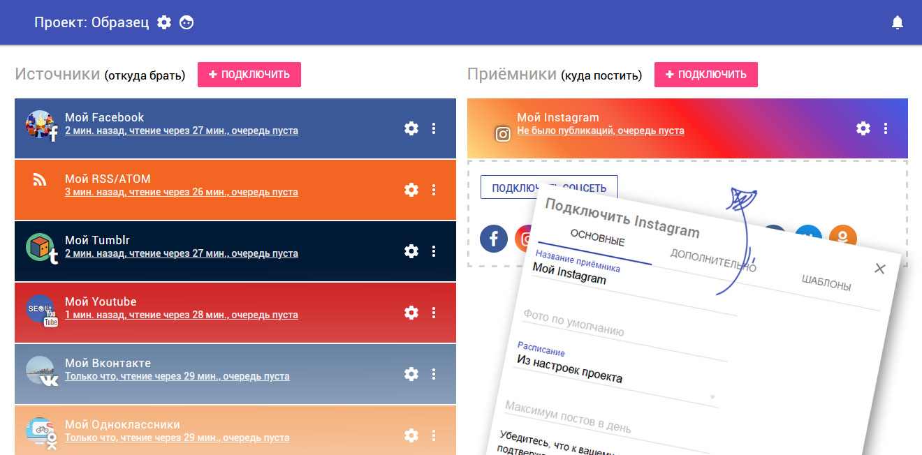 С помощью SEOlit можно настроить в Instagram кросспостинг из 6 других соцсетей: YouTube, Facebook, ВКонтакте, Tumblr, Одноклассники, а также с другой страницы в Instagram. SEOlit упростит работу с контент-планом: там можно составлять расписание отложенного постинга, настраивать автоматическое удаление постов, быстро теряющих актуальность, выбирать время публикации постов и делать многое другое.