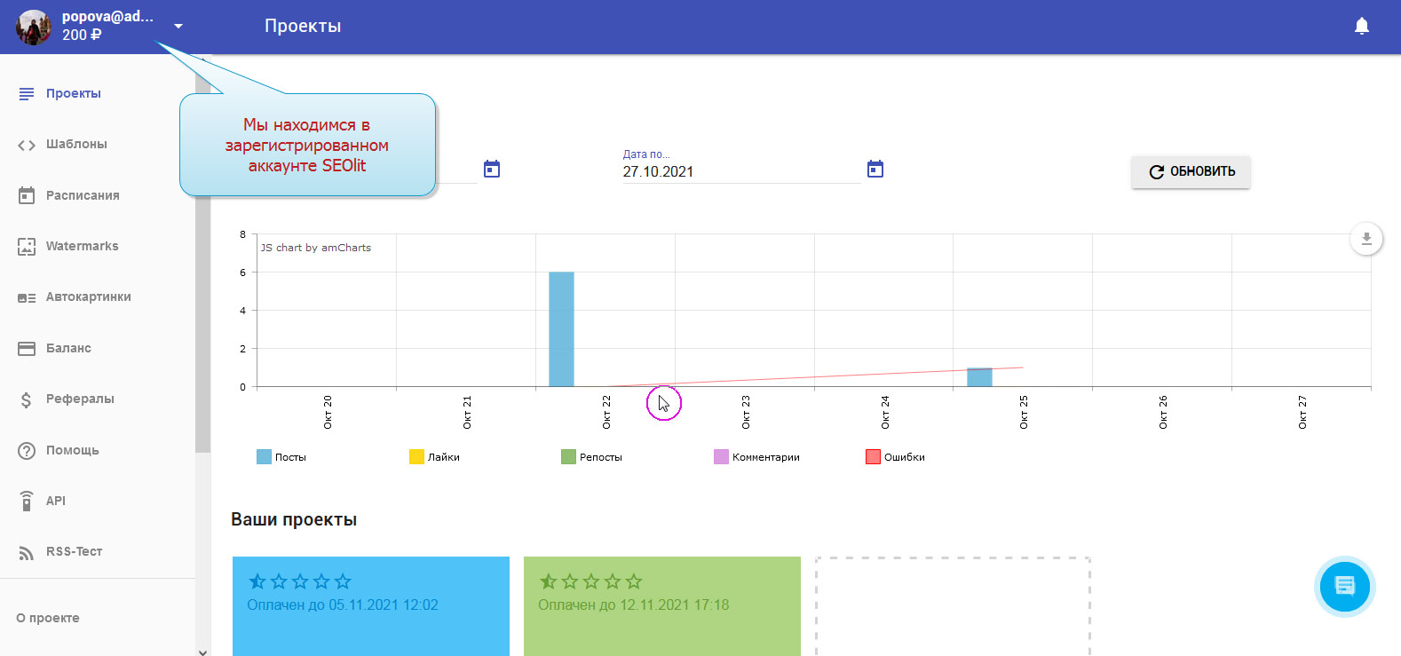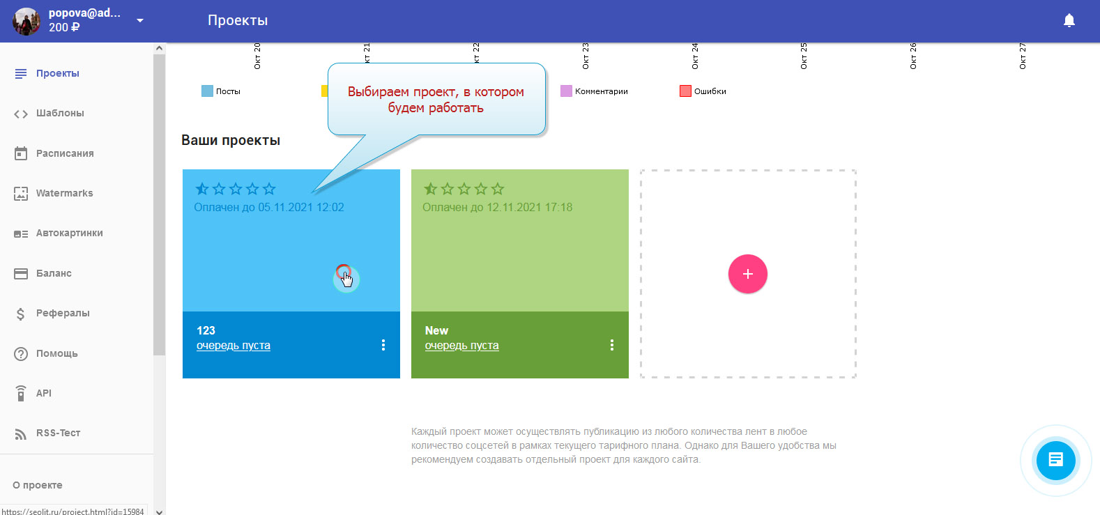 1. Вы вошли в свой профиль в Сеолите и находитесь на стадии выбора проекта.