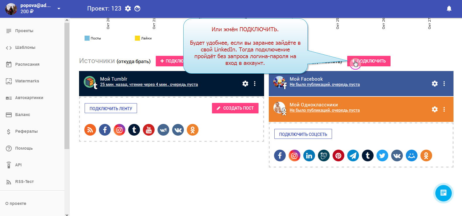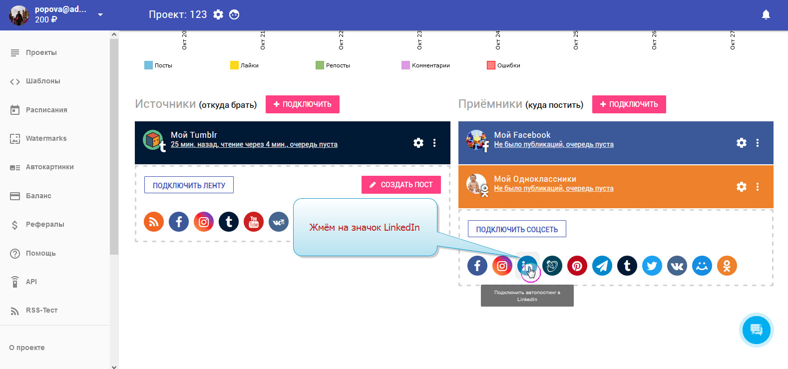 Всю инструкцию по подключению аккаунта LinkedIn в приёмники можно просмотреть здесь картинках по этапам:
