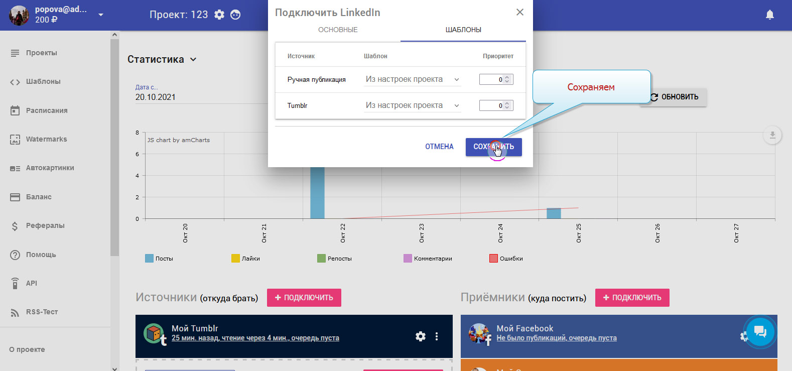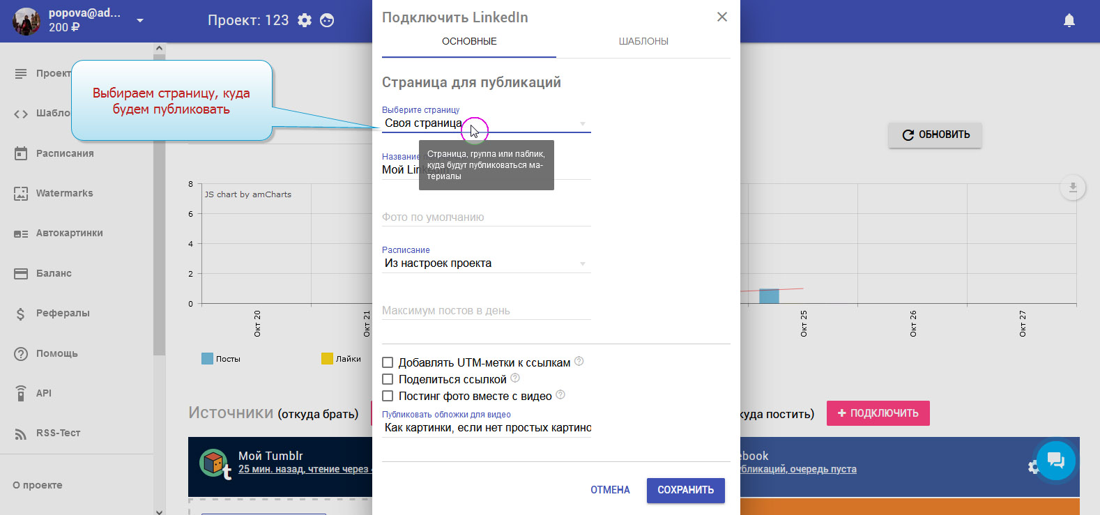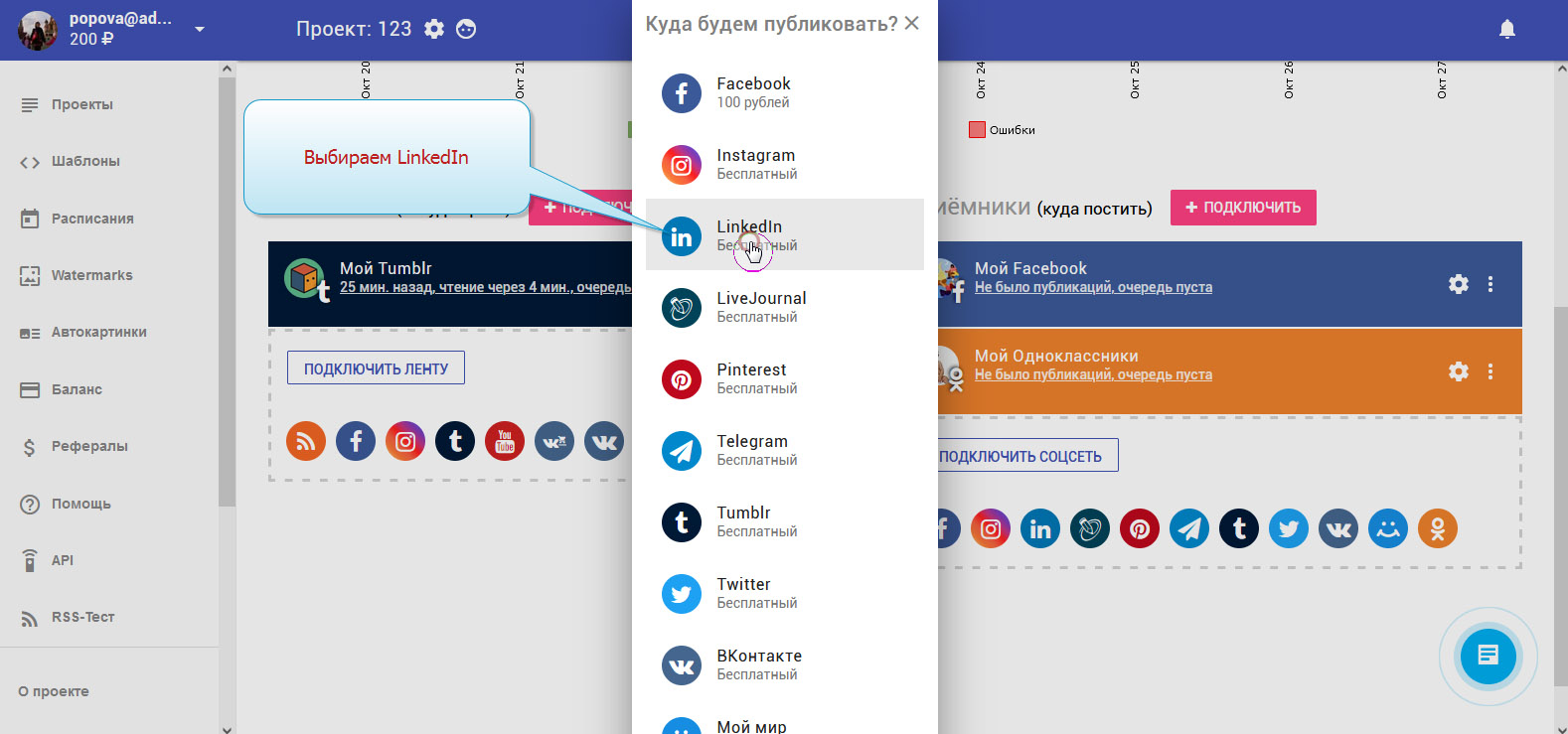 Чтобы записи публиковались в LinkedIn автоматически, необходимо добавить LinkedIn в приёмники.