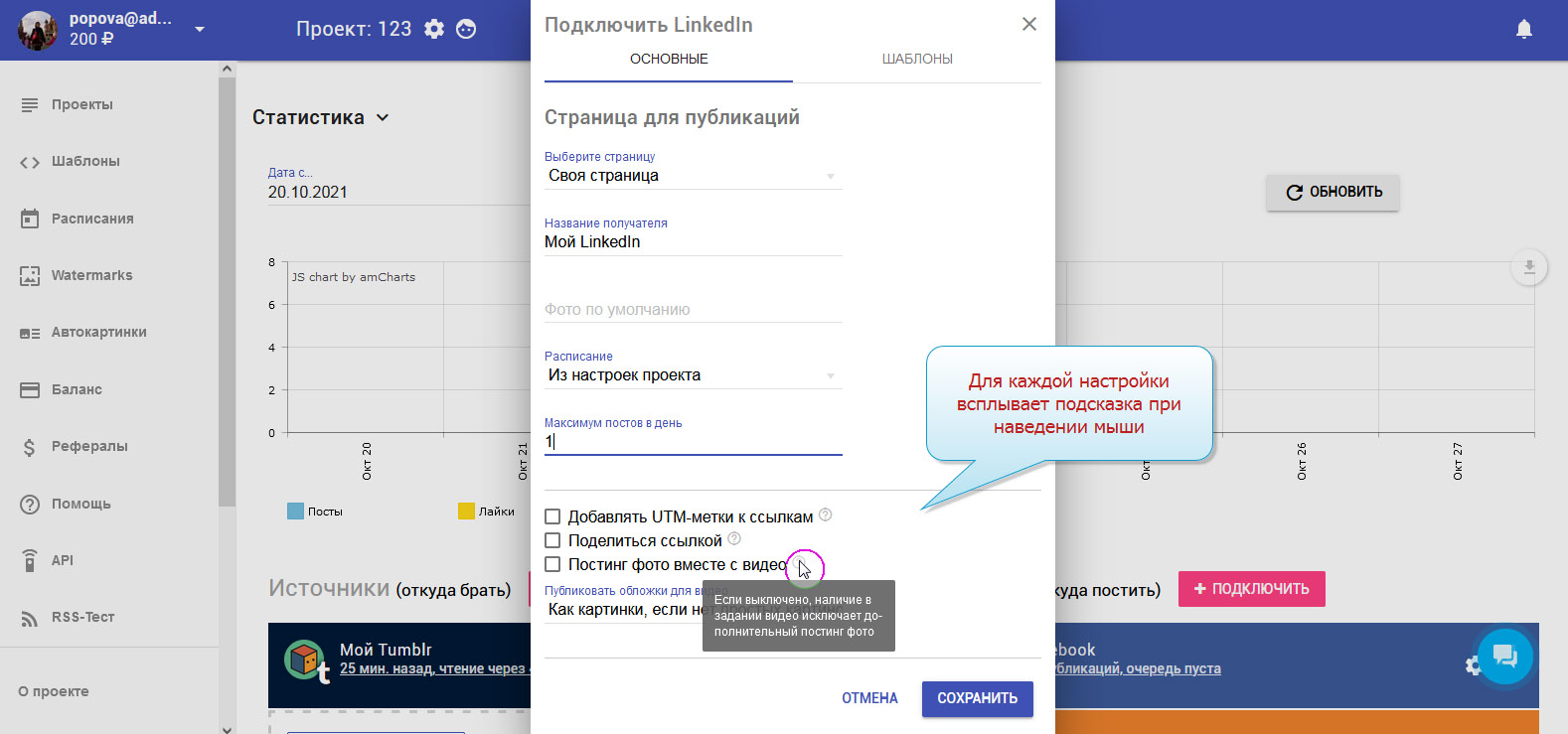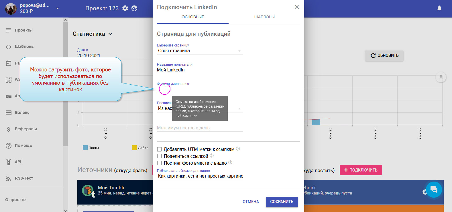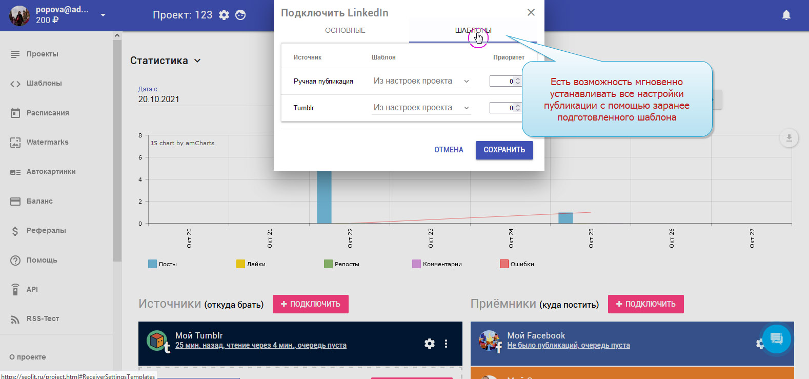 Чтобы записи публиковались в LinkedIn автоматически, необходимо добавить LinkedIn в приёмники.
