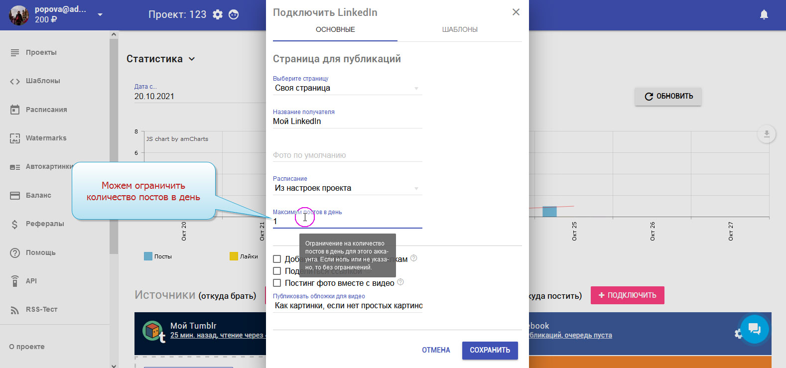 8. Можем ограничить количество постов в день.