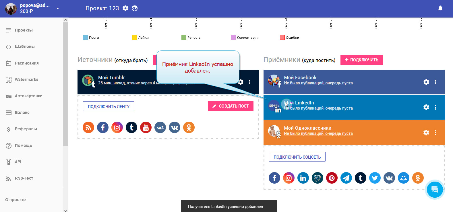 12. Добавление соцсети LinkedIn завершено. В колонке с приёмниками вы можете увидеть ваш добавленный аккаунт.