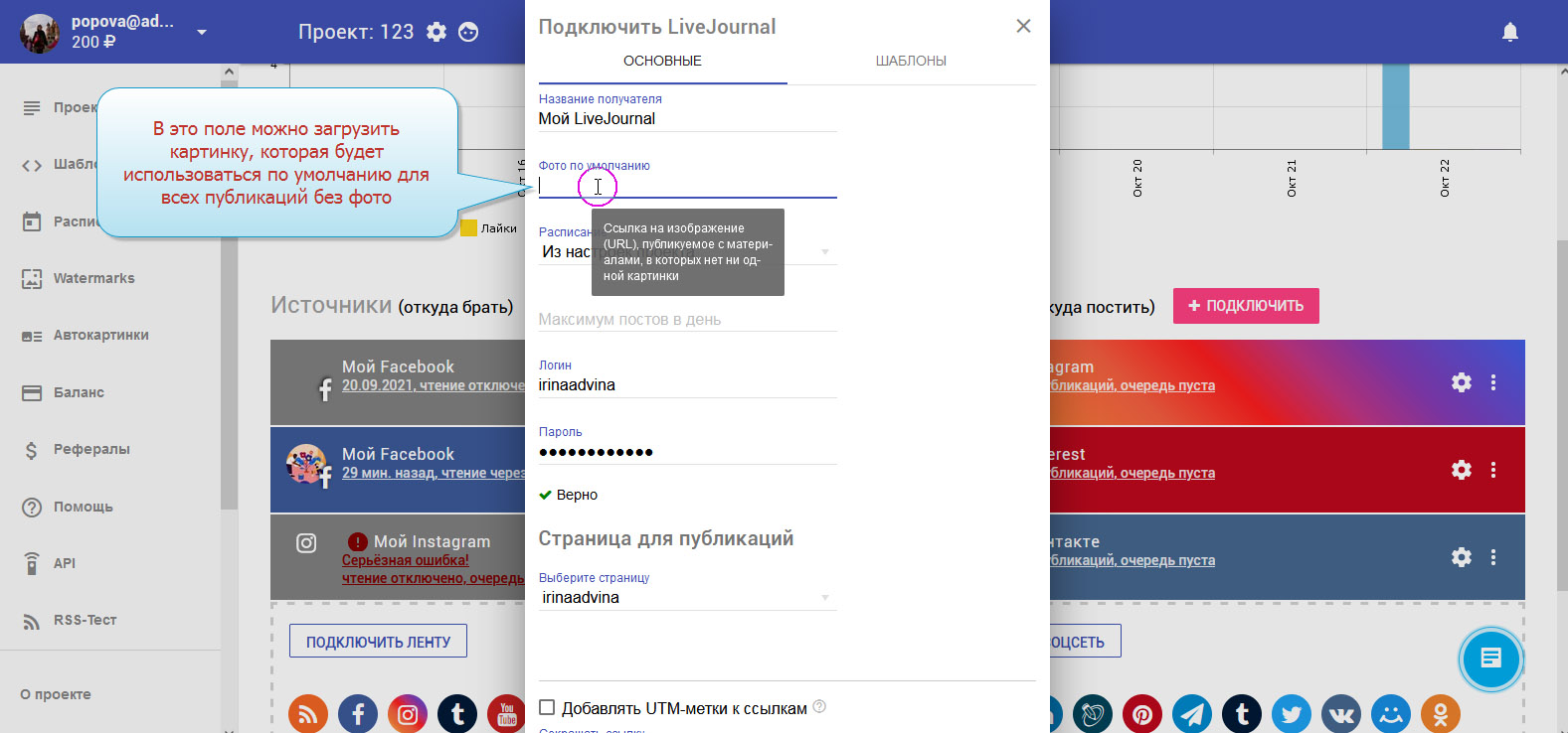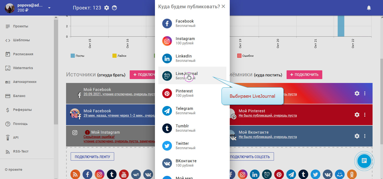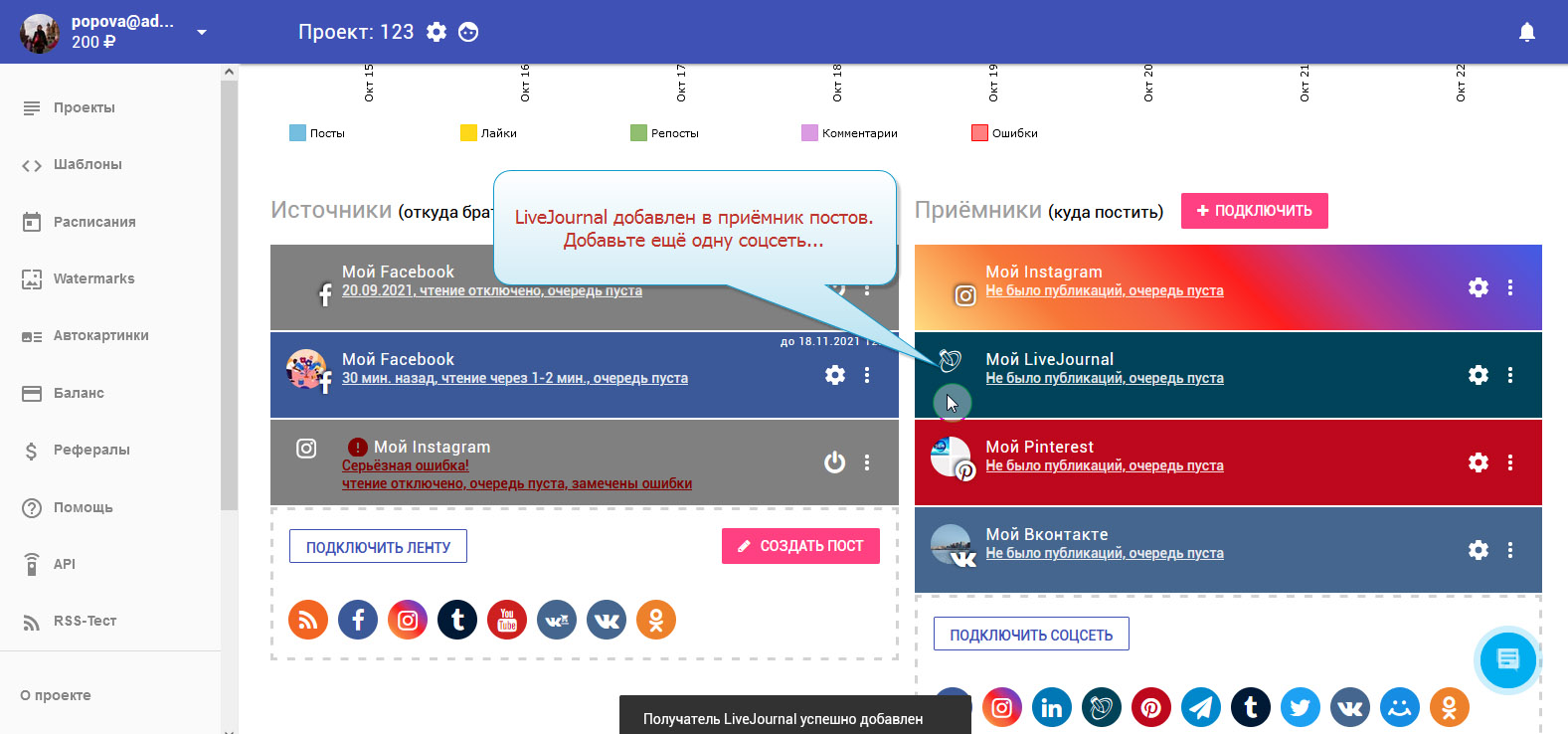 11. LiveJournal подключён. В колонке с приёмниками вы можете видеть ваш добавленный аккаунт.
