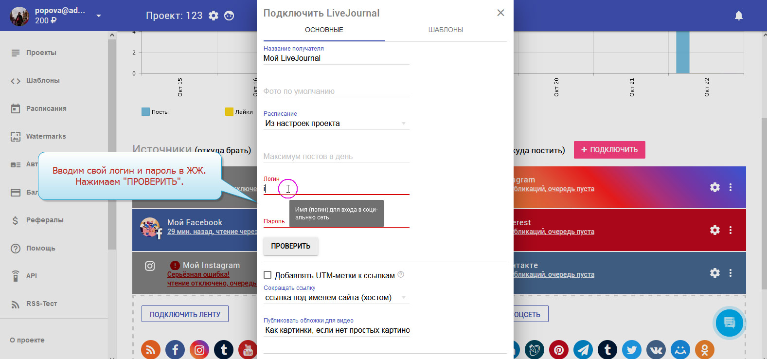 5. Вводим свои логин и пароль для входа в аккаунт LiveJournal. Нажимаем "ПРОВЕРИТЬ".