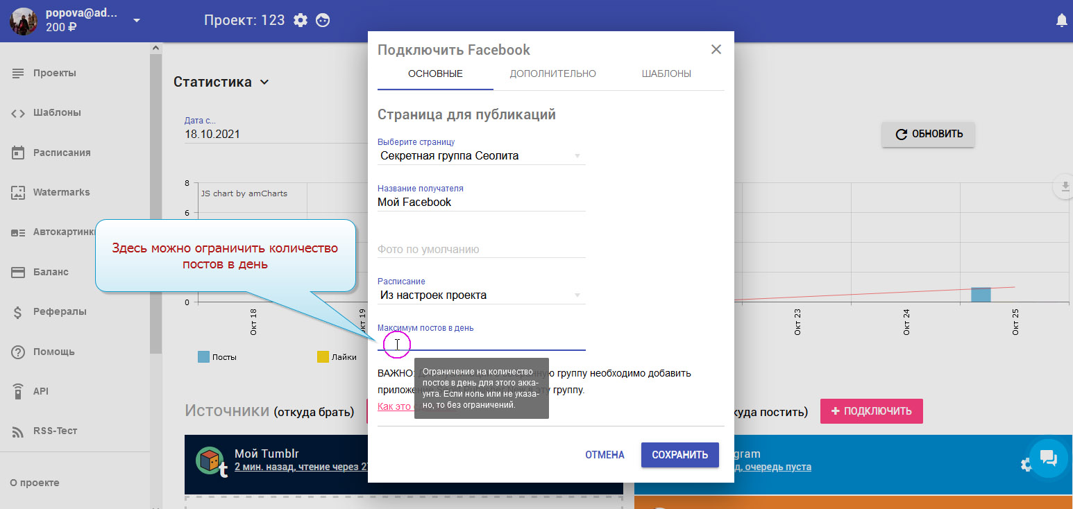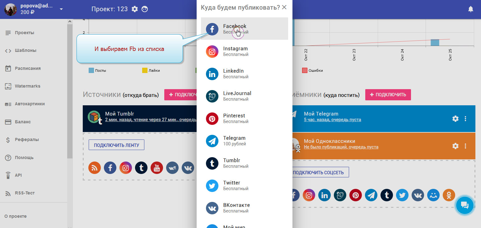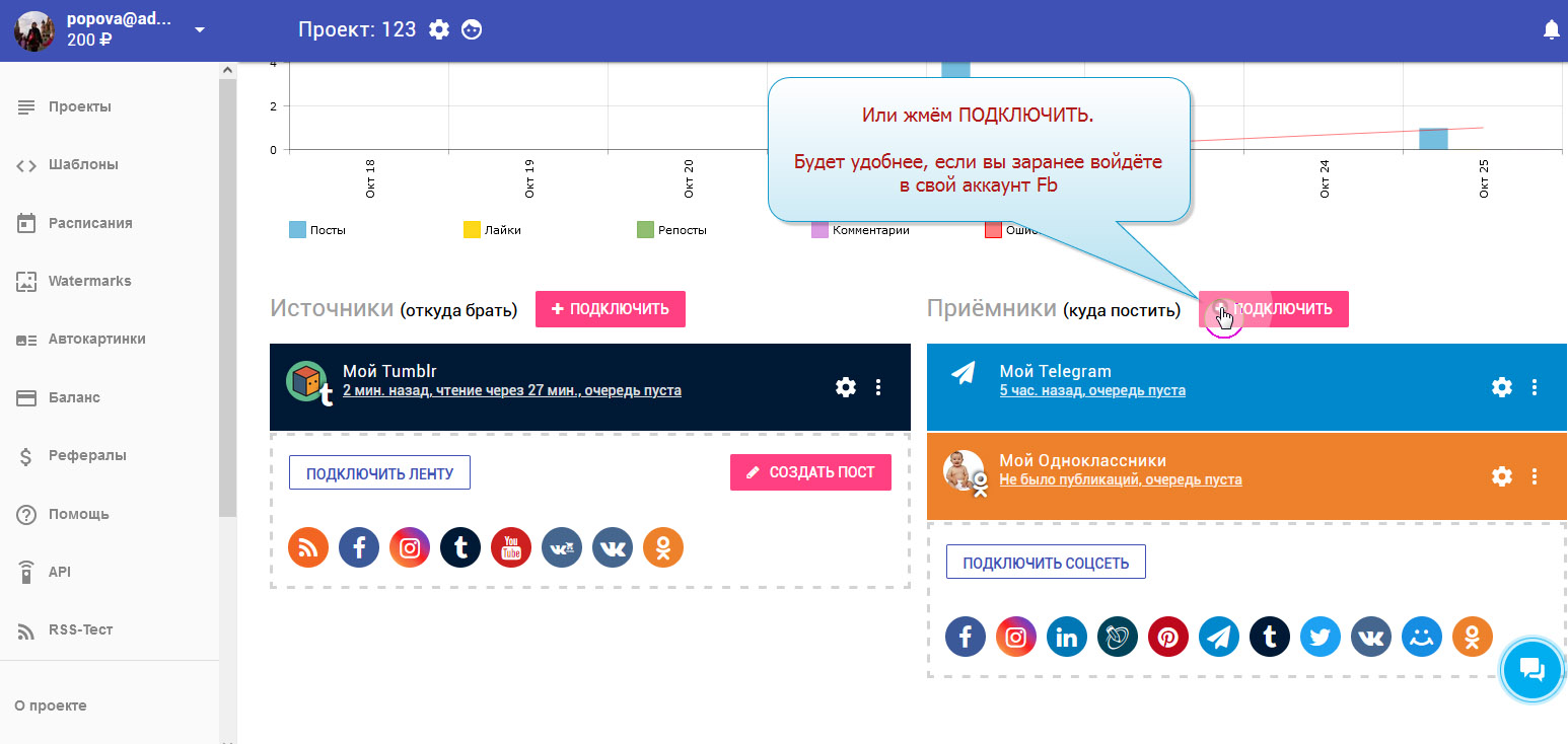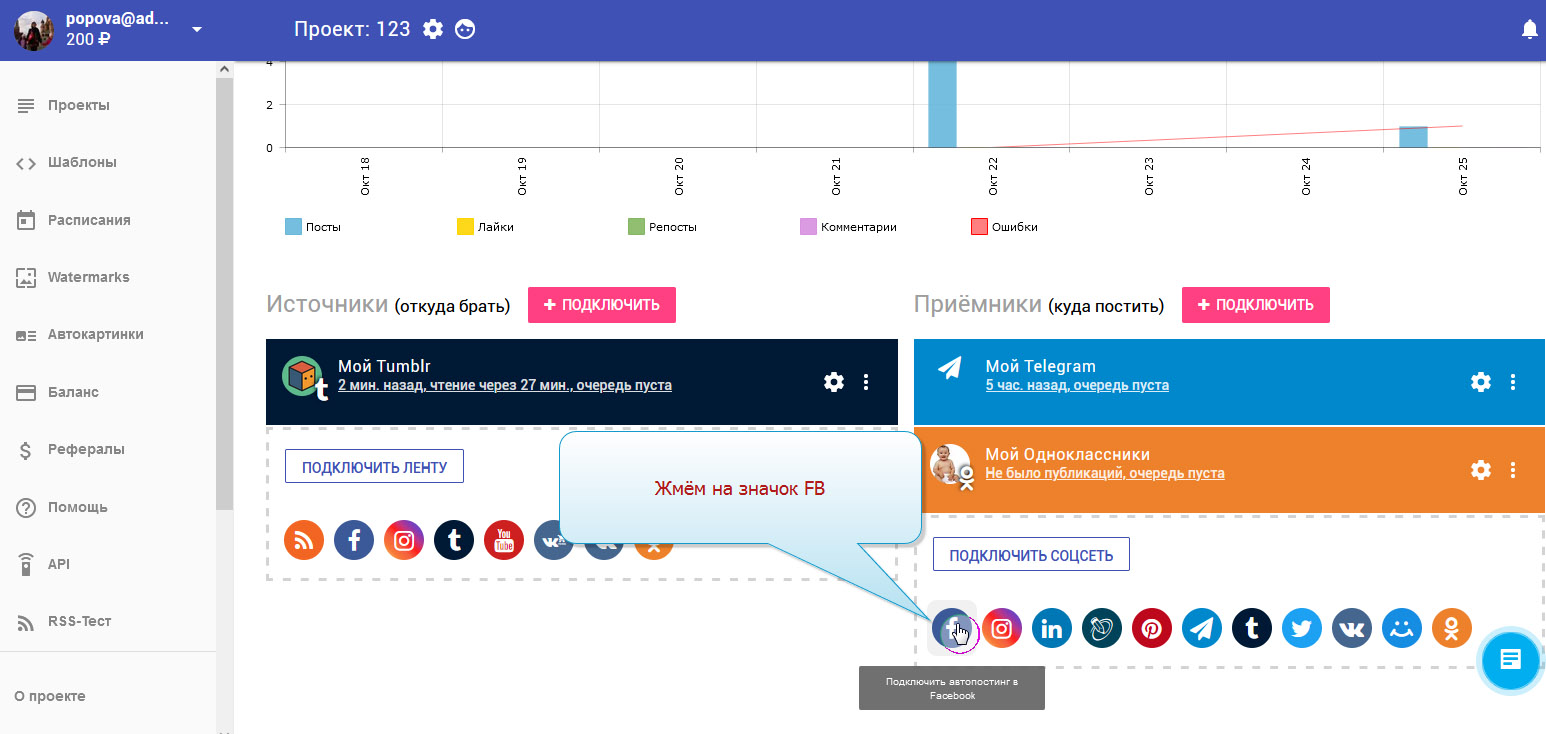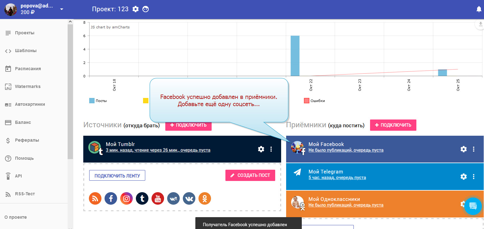 Всю инструкцию добавления Facebook в приёмники вместе с добавлением приложения в группу можно просмотреть здесь в картинках по этапам: