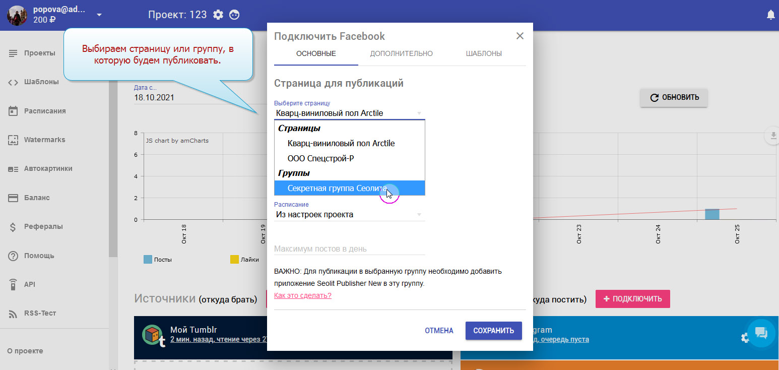 6. Выбираем страницу или группу, в которую будем публиковать.