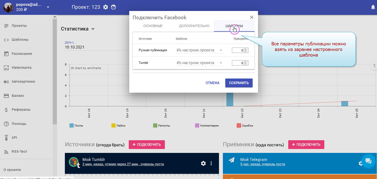 21. Есть возможность быстро задать все настройки публикации с помощью заранее созданного шаблона. См. инструкцию по созданию шаблонов.