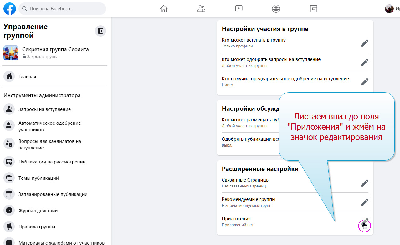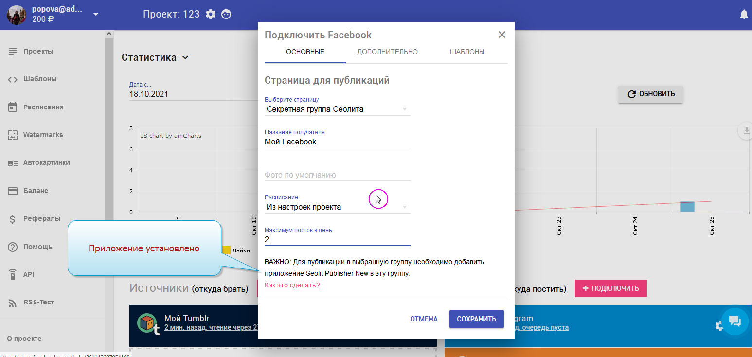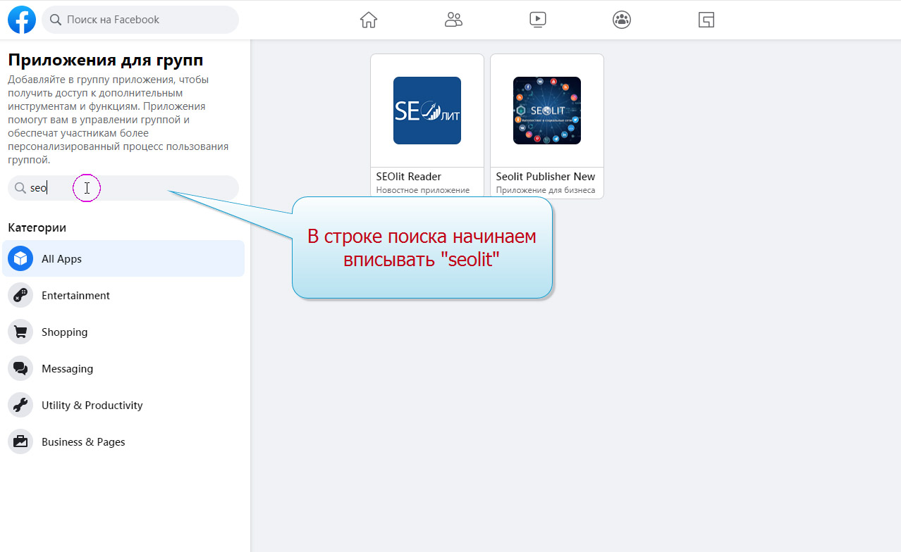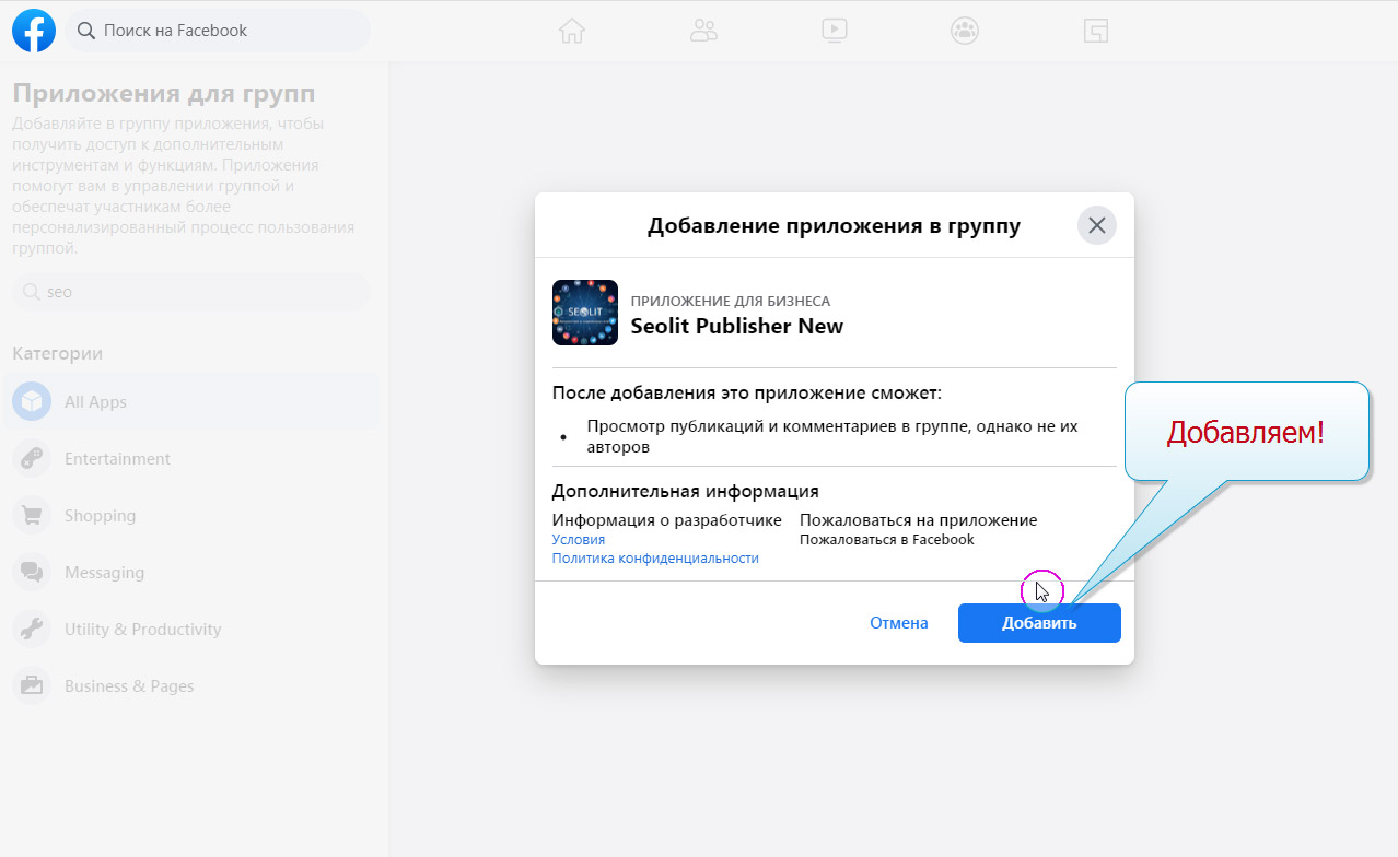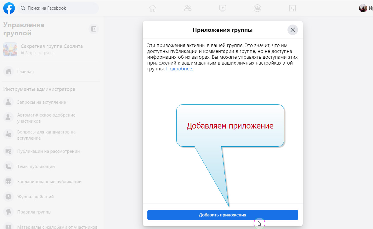 19. Приложение в группу FB установлено. Продолжим подключение на СЕОлите.