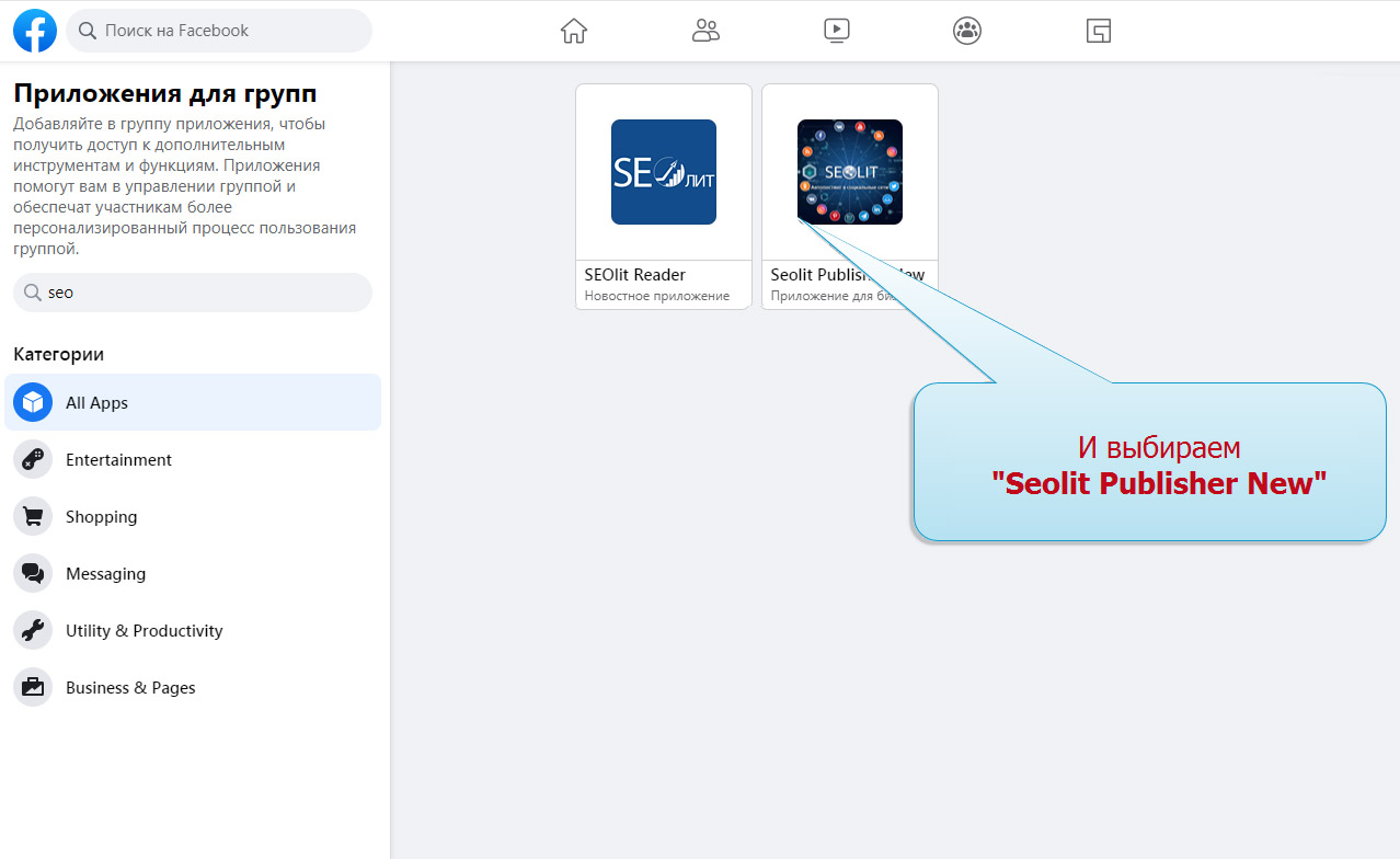 9. Если публикация пойдёт в группу FB, то необходимо установить в эту группу приложение SEOlit Publisher New.