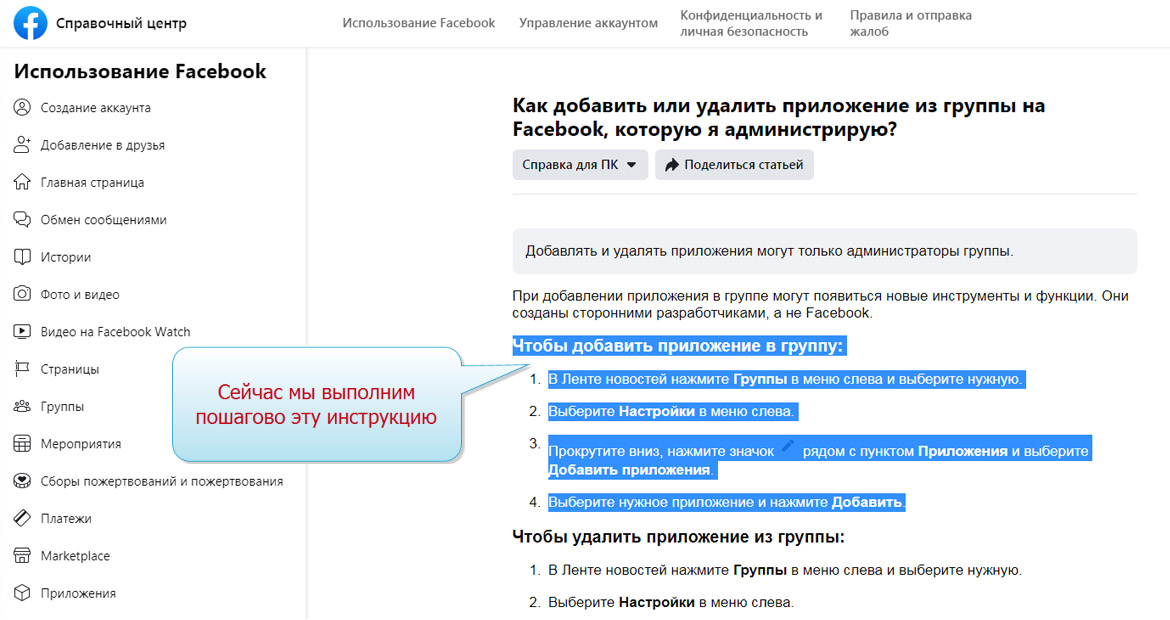 10. Прочитаем инструкцию и добавим приложение в группу.