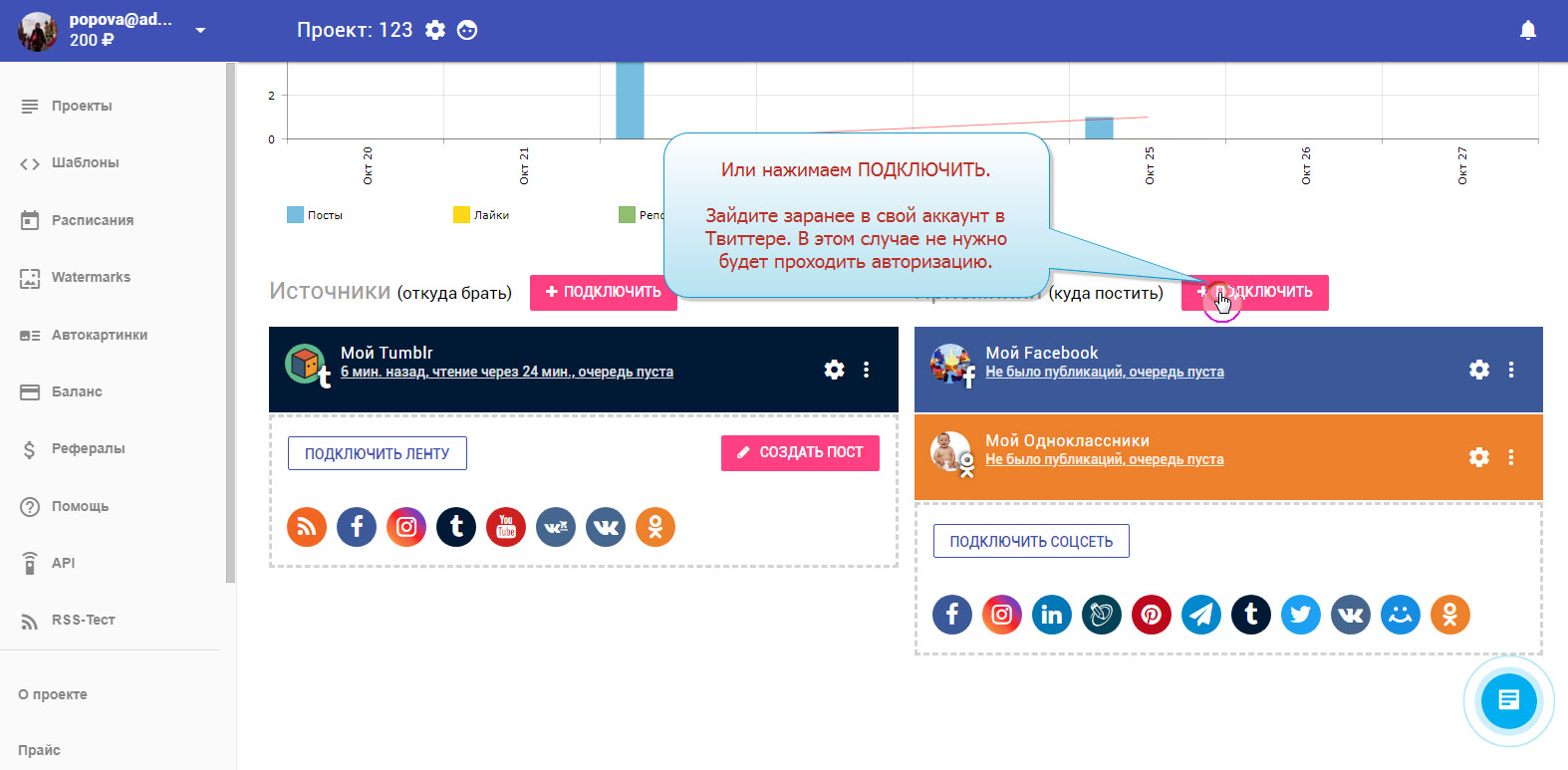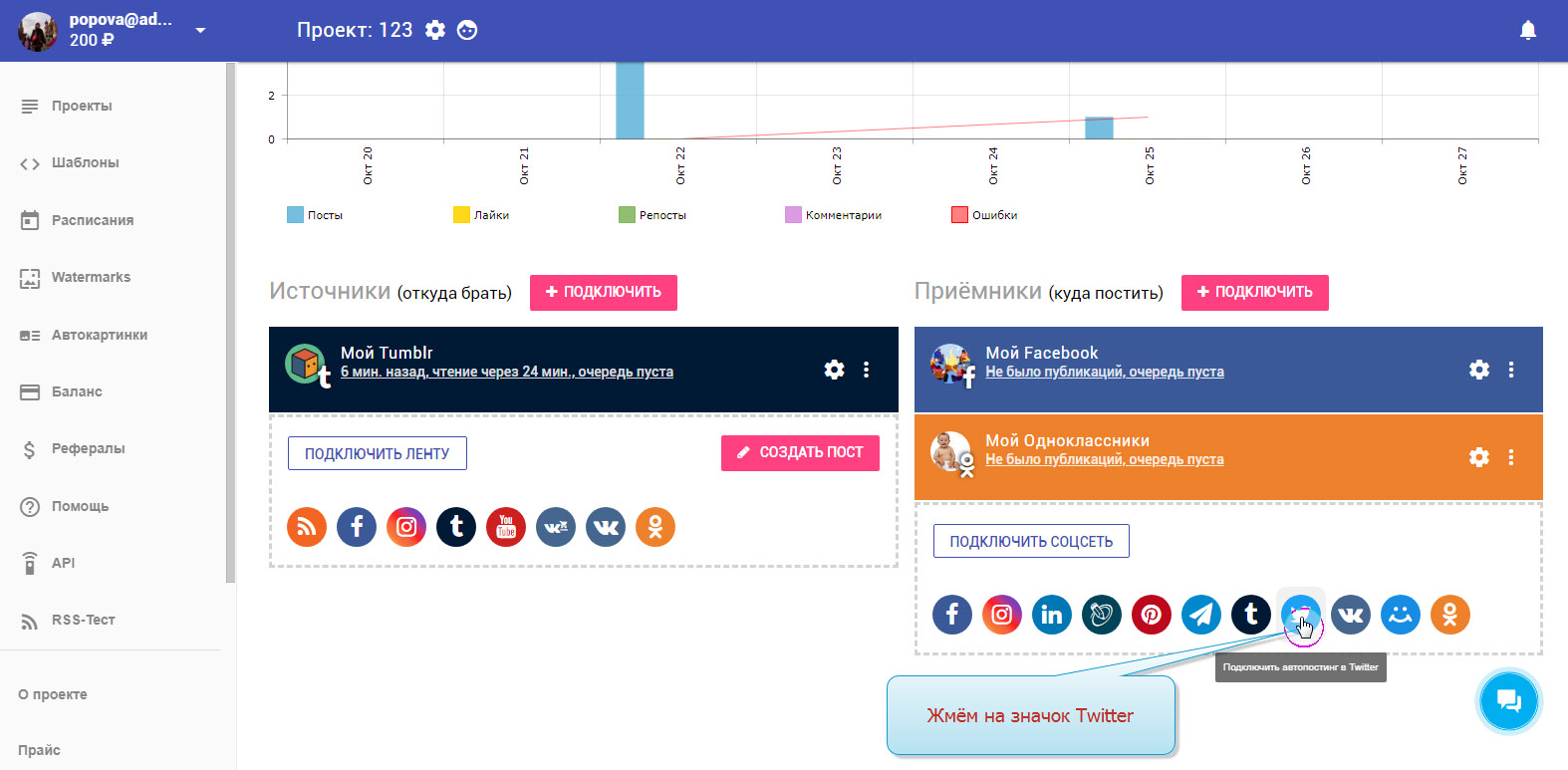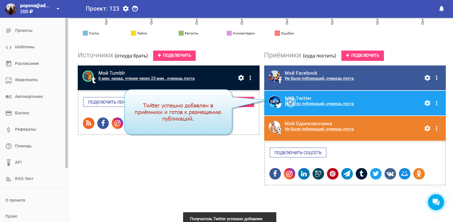 14. Добавление Twitter завершено. В колонке с приёмниками вы можете видеть свой аккаунт.