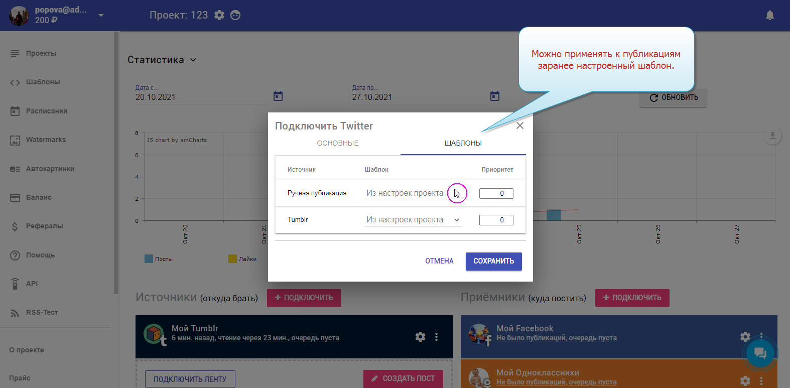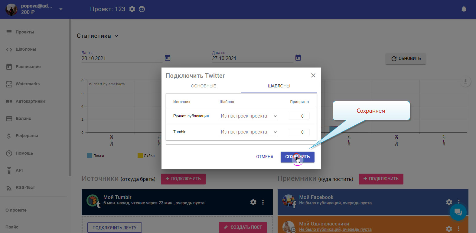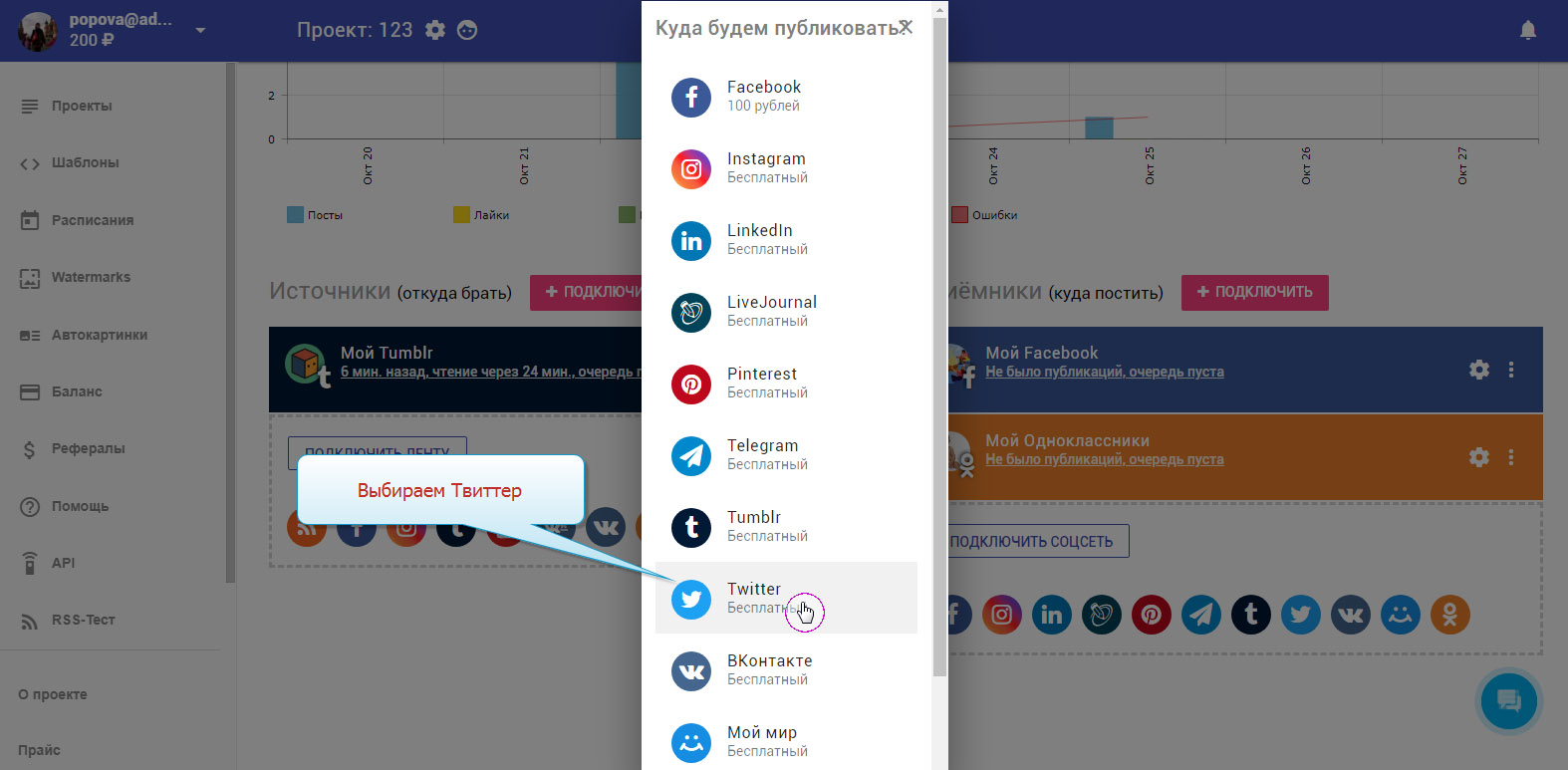 Чтобы записи публиковались в Twitter автоматически, необходимо добавить Twitter в приёмники.