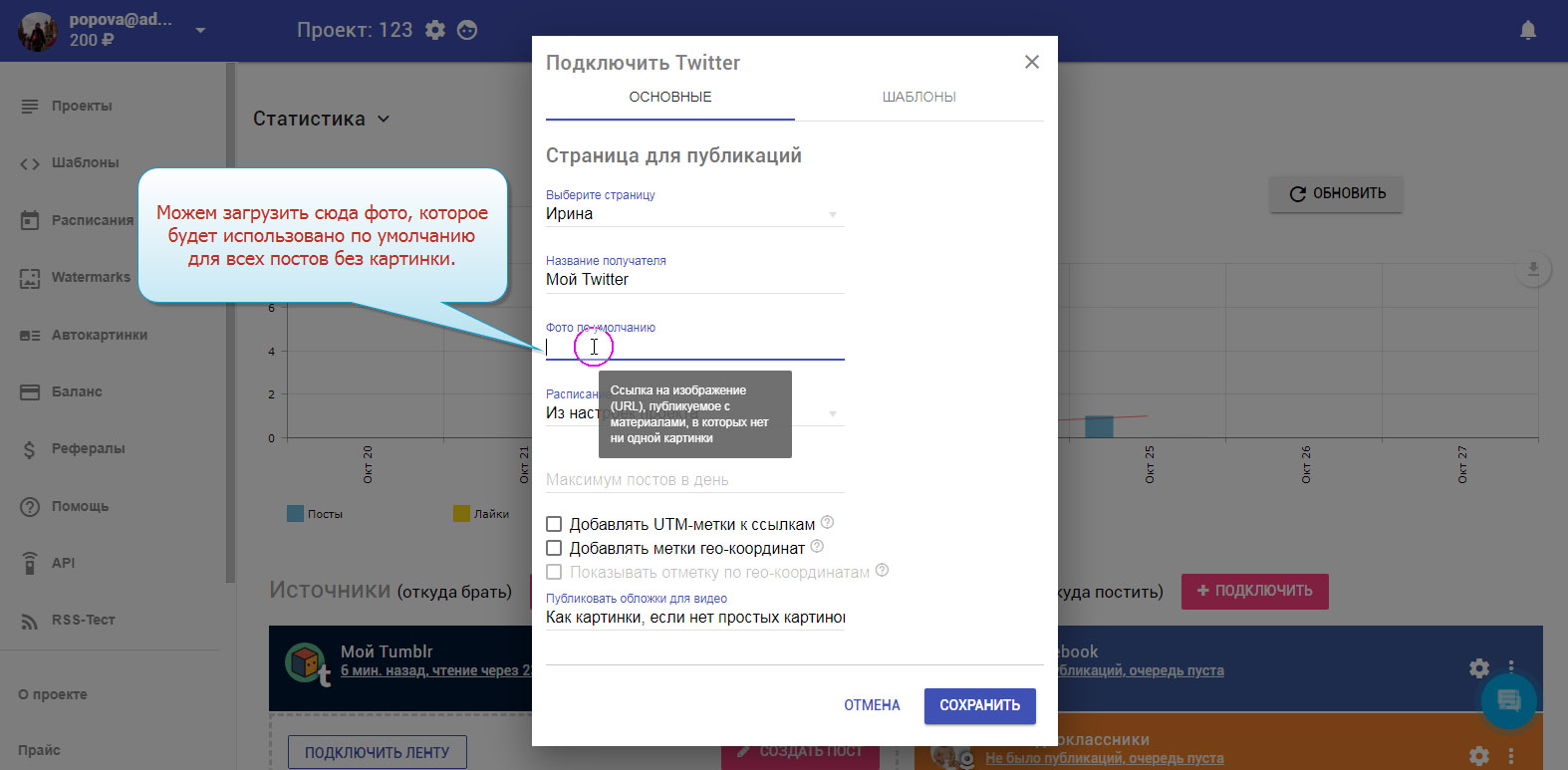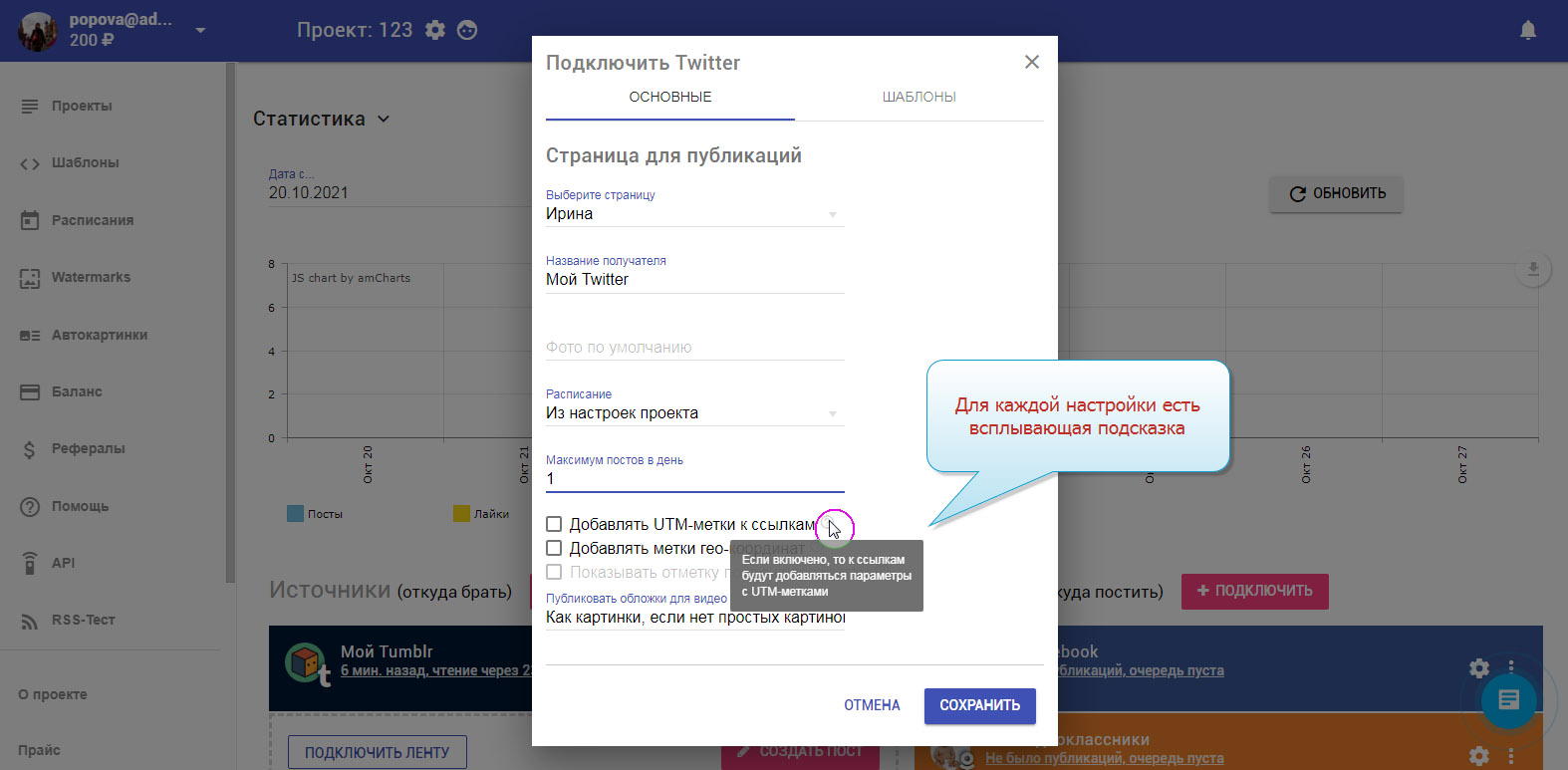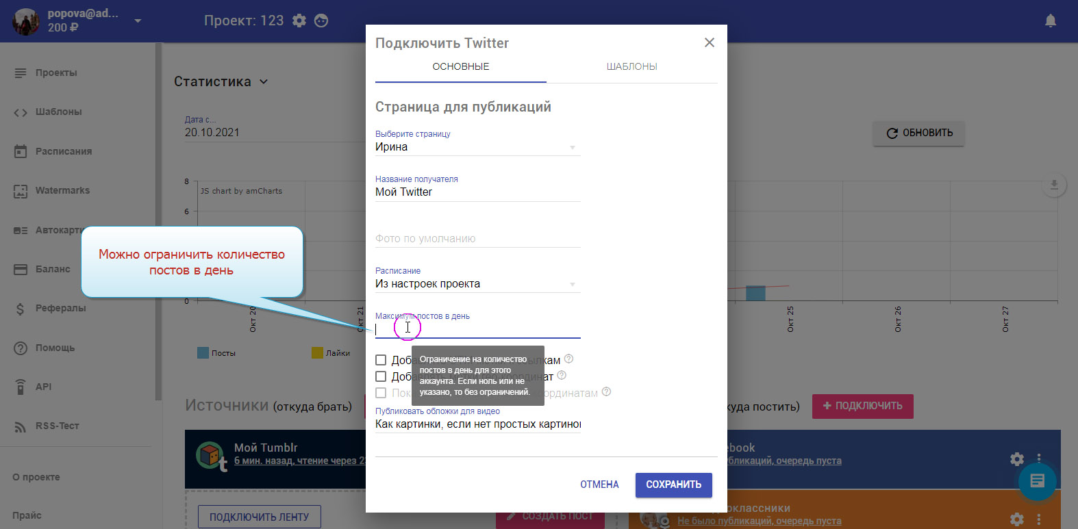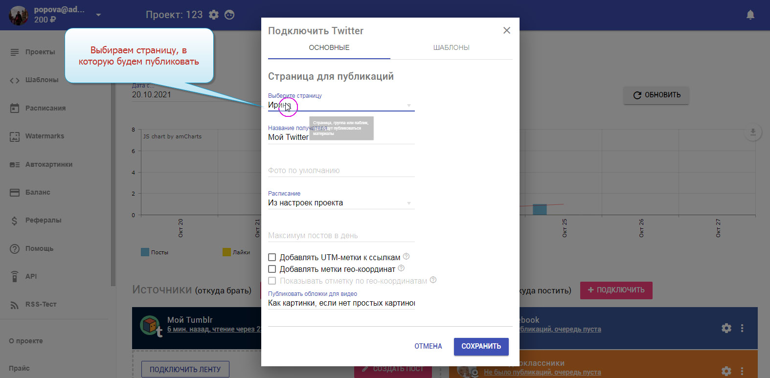 Чтобы записи публиковались в Twitter автоматически, необходимо добавить Twitter в приёмники.