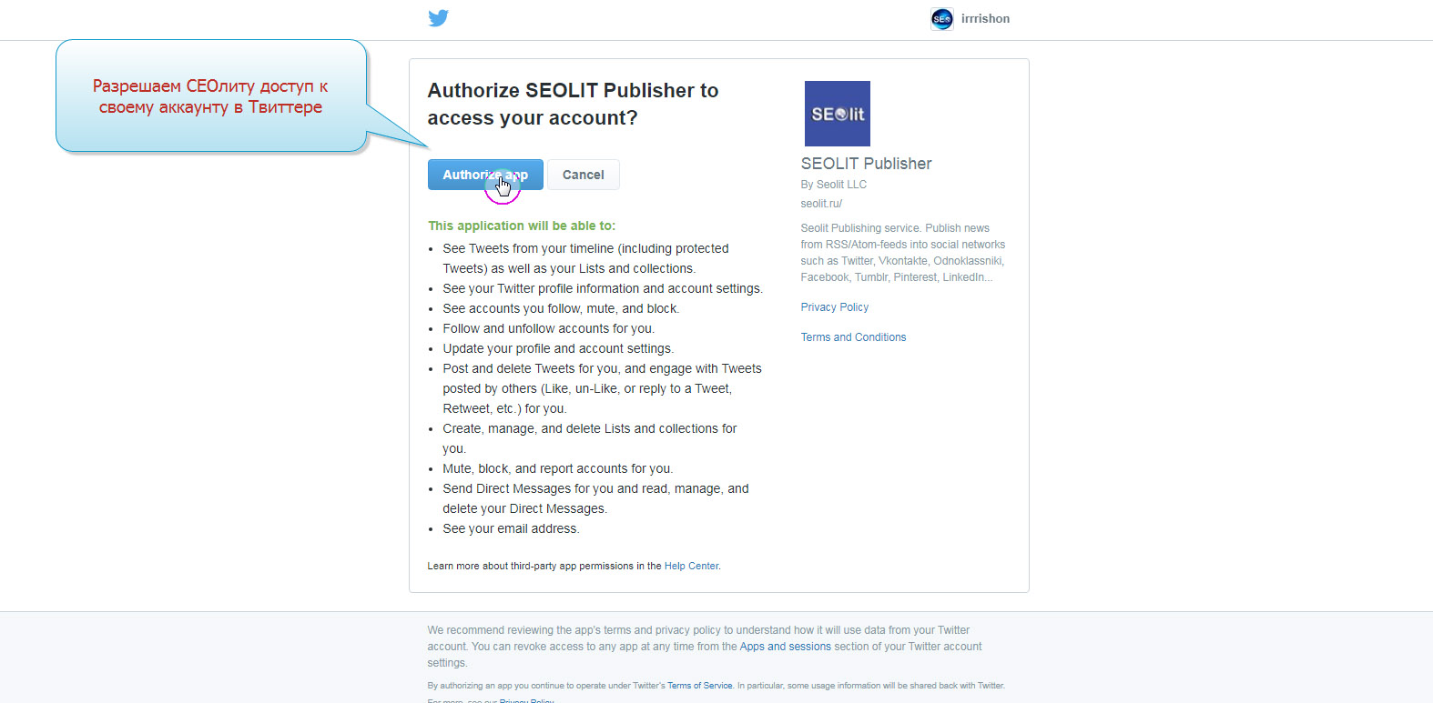 6. Разрешаем СЕОлиту доступ к вашему аккаунту Twitter.