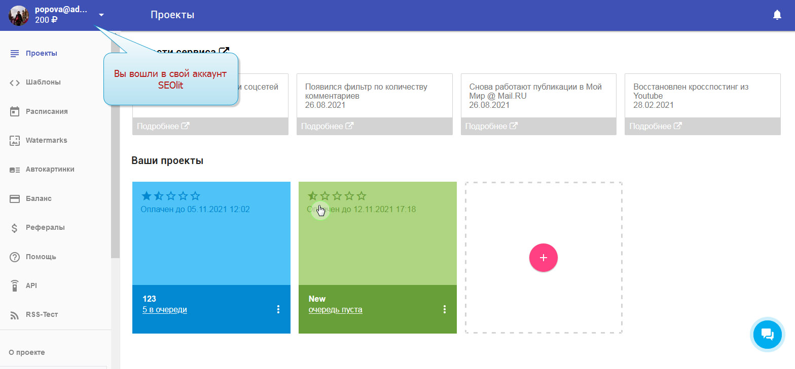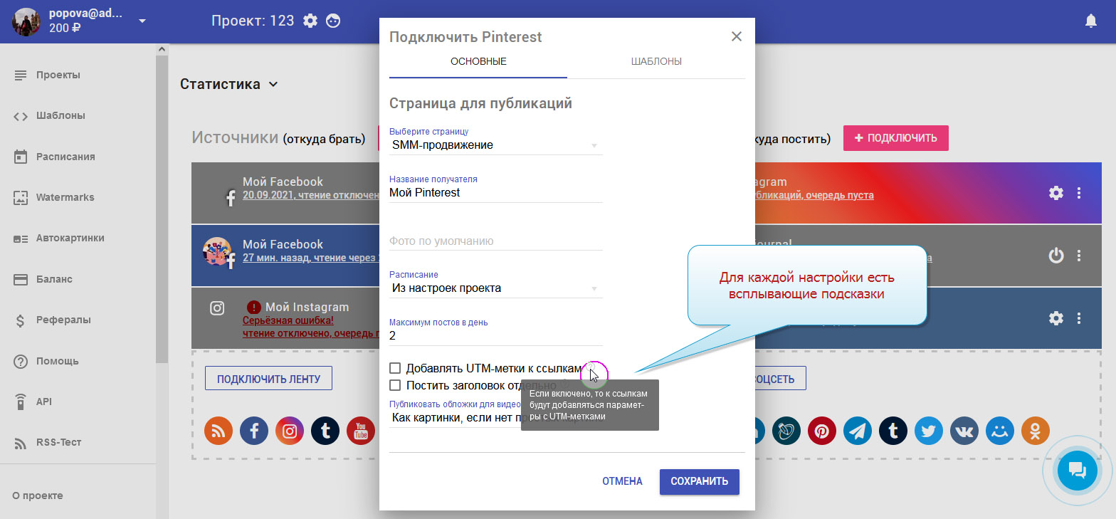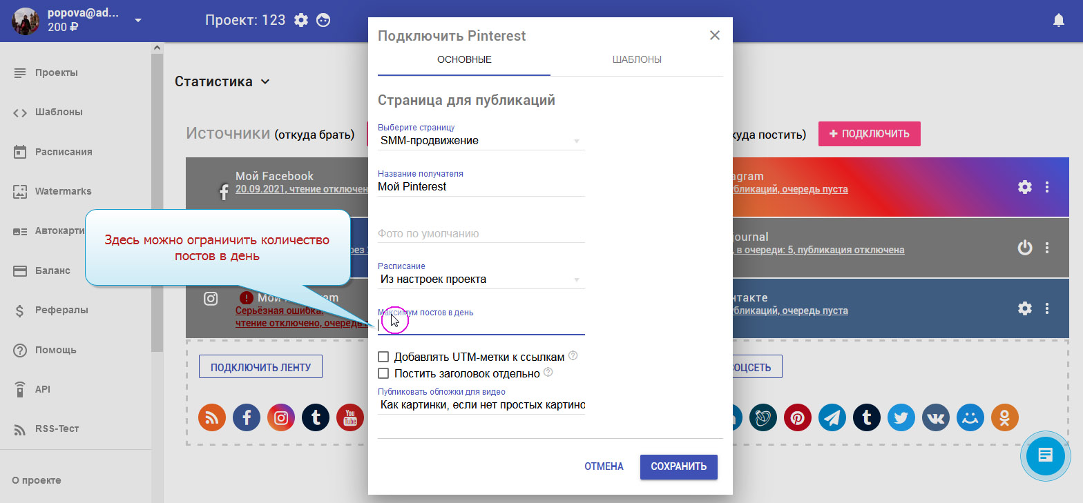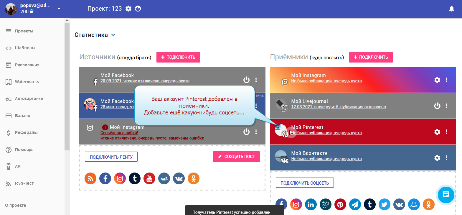 13. Добавление соцсети Pinterest завершено. В колонке с приёмниками появился ваш аккаунт.