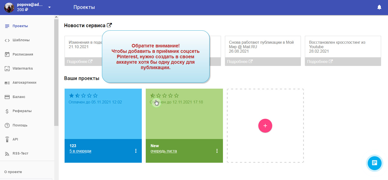 Обращаем Ваше внимание! Для того чтобы добавить в приёмник соцсеть "Pinterest", необходимо в своём аккаунте в соцсети создать хотя бы одну доску для публикации.