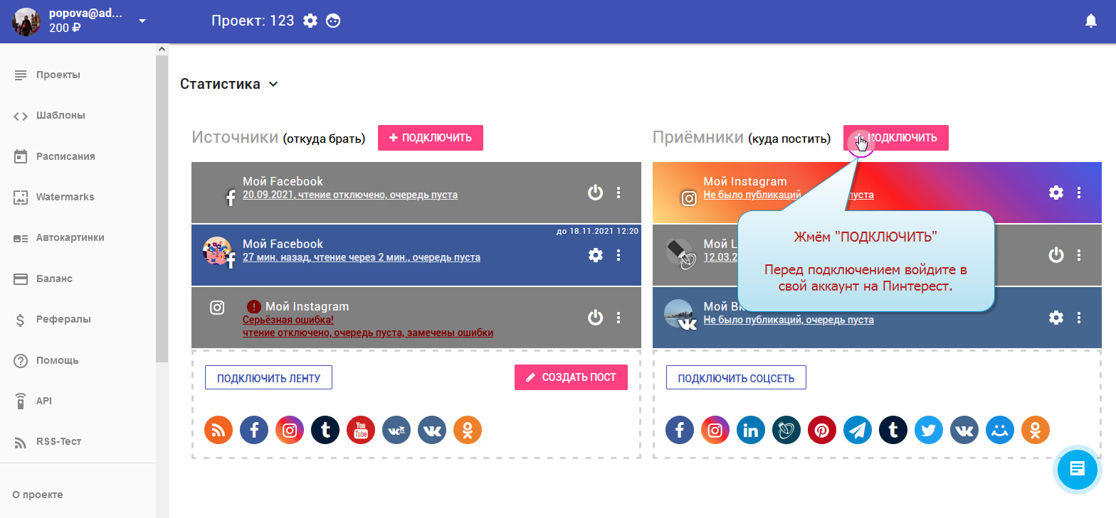 4. Нажимаем "ПОДКЛЮЧИТЬ" в колонке приёмников. Будет удобнее, если вы войдёте в свой Pinterest заранее.