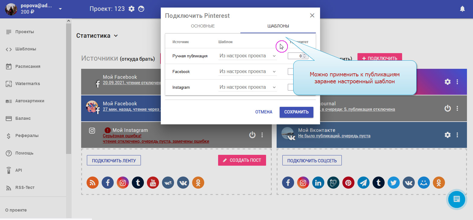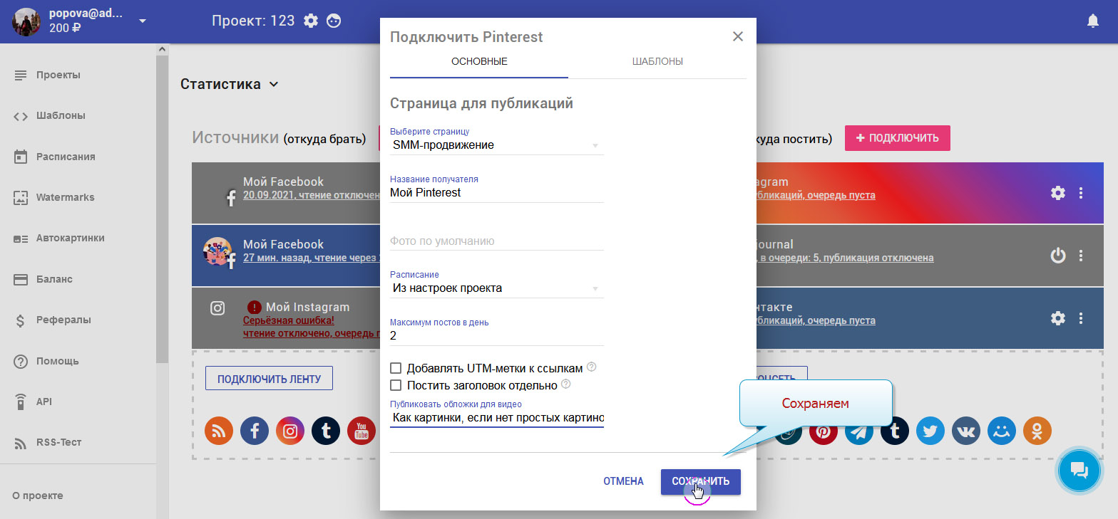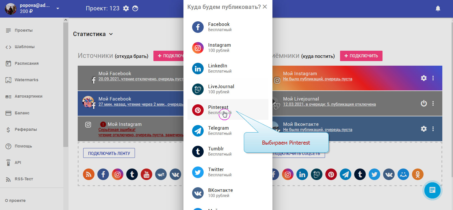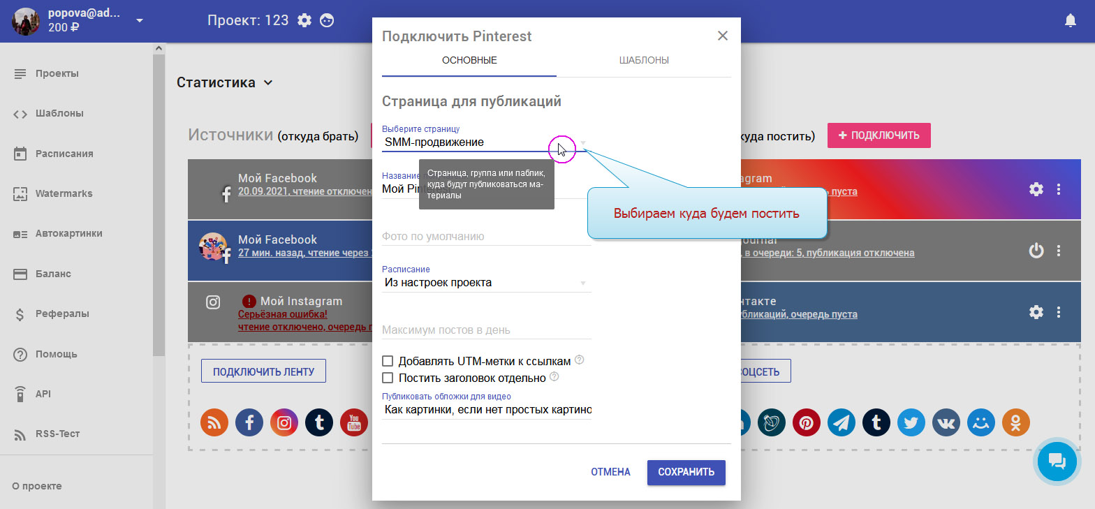 Всю инструкцию по подключению аккаунта Pinterest в приёмники можно просмотреть здесь картинках по этапам: