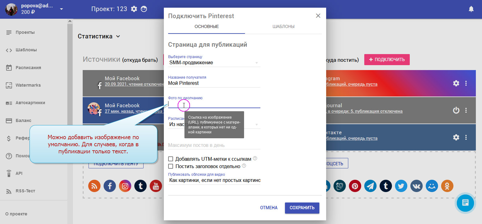8. Можно ввести url картинки по умолчанию. Она пригодится только для текстовых публикаций без изображения.