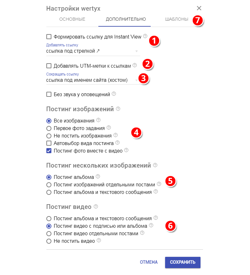 4,5,6 Это поле позволяет настроить публикацию поста в необходимом виде в формате текст-картинка-видео. Наводя мышь на иконку со знаком "?" справа от текста, можно увидеть комментарий к каждому пункту настроек.