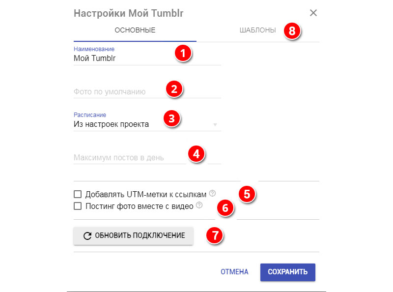 7. Если вы меняли данные доступа к аккаунту в Tumblr, или у вас в истории публикаций обнаружились ошибки, нажмите кнопку "Обновить подключение".