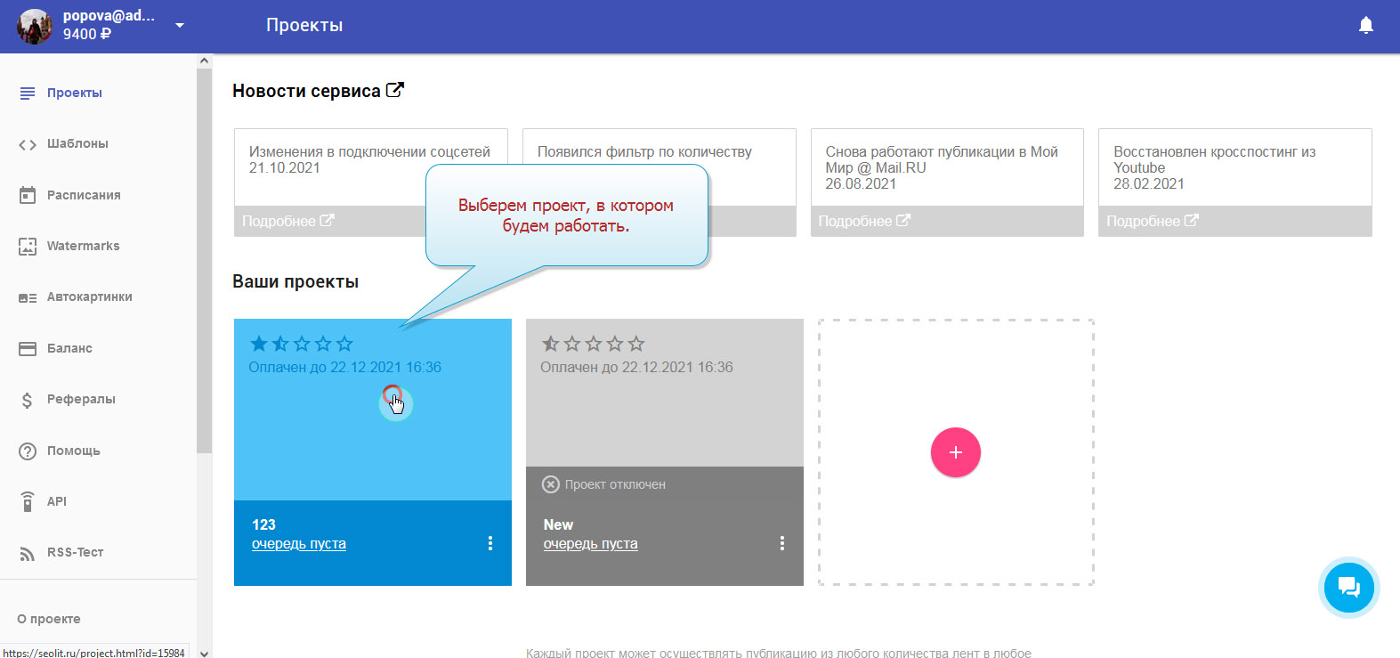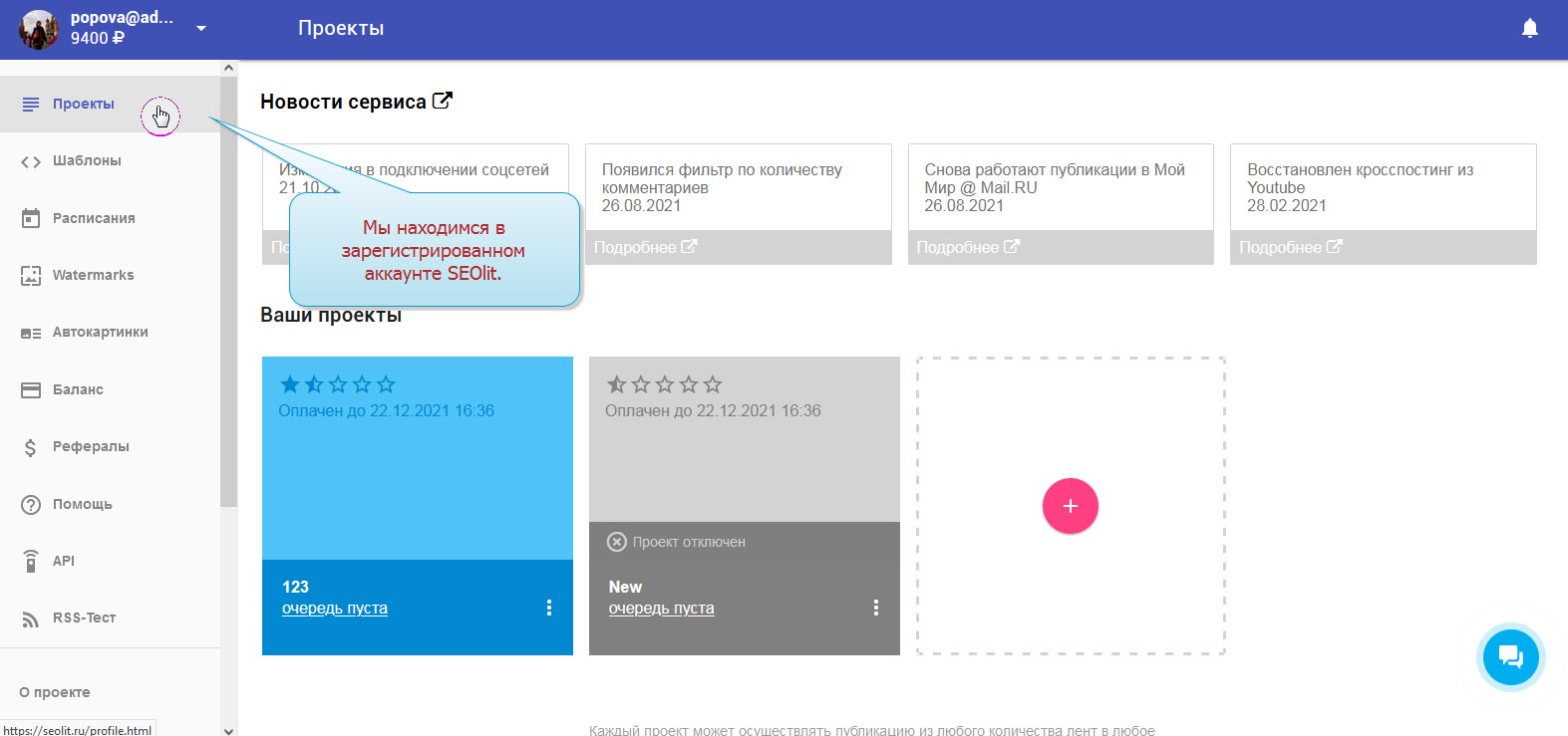 1. Вы вошли в свой аккаунт на Сеолите и находитесь на стадии выбора проекта.