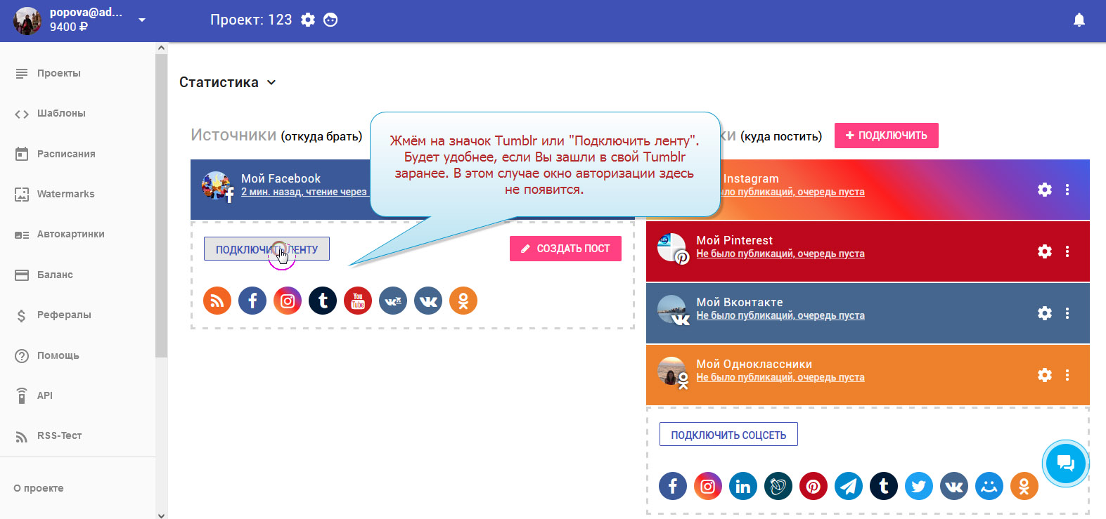 3. В колонке "Источники" нажимаем "ПОДКЛЮЧИТЬ ЛЕНТУ" или просто жмём на значок Tumblr. Вам будет удобнее, если Вы войдёте в свой Tumblr заранее. В этом случае не надо будет проходить авторизацию здесь.