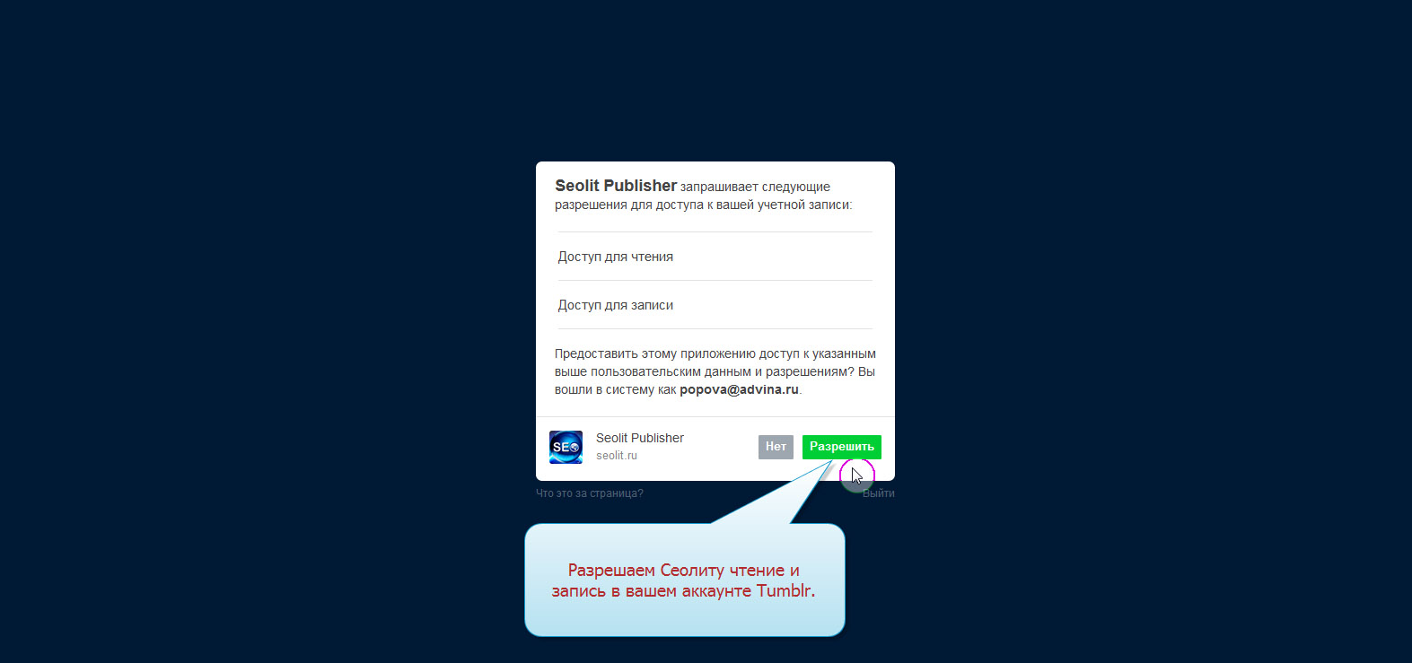 4. Разрешаем СЕОлиту работать с Вашим аккаунтом Tumblr.