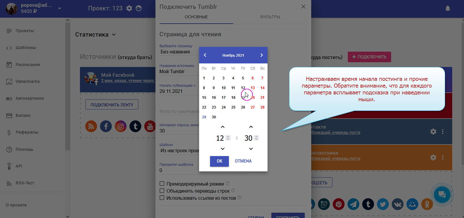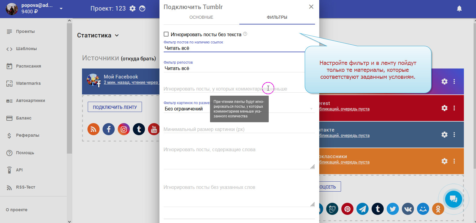 Чтобы записи публиковались в соцсетях автоматически, необходимо настроить ленту "Tumblr".