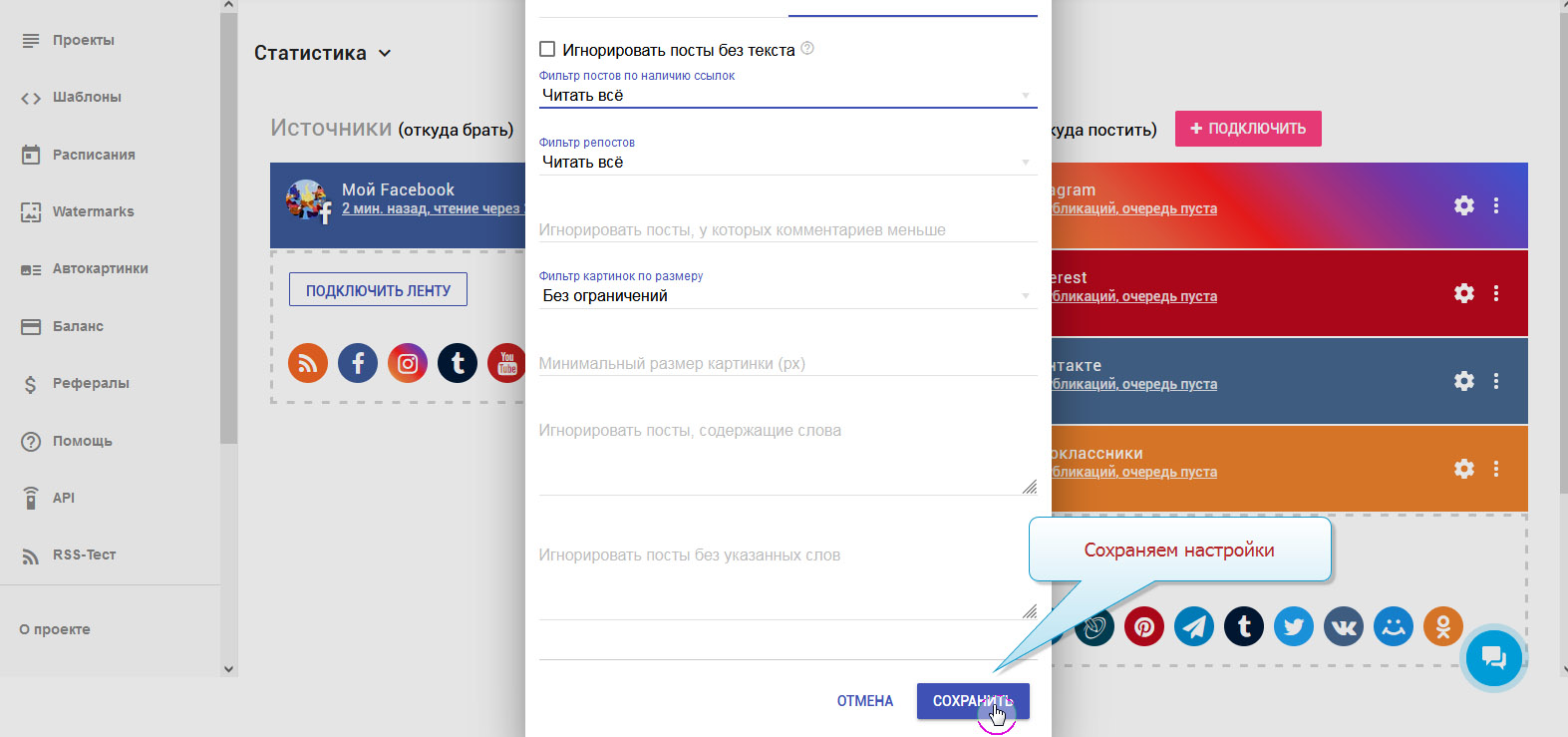 6. Настраиваем фильтрацию публикаций. Тиражироваться будут только те материалы, которые соответствуют заданным условиям.