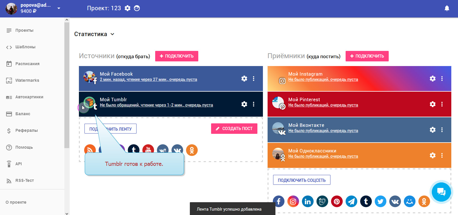 8. Tumblr успешно добавлен в Источники и готов к работе.