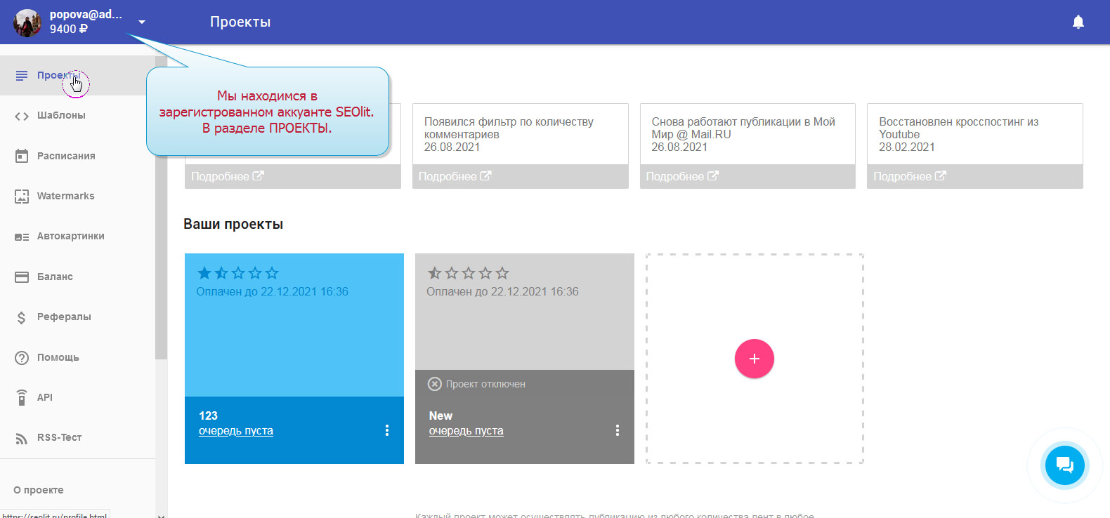 1. Вы вошли в свой профиль в Сеолите и находитесь на стадии выбора проекта.