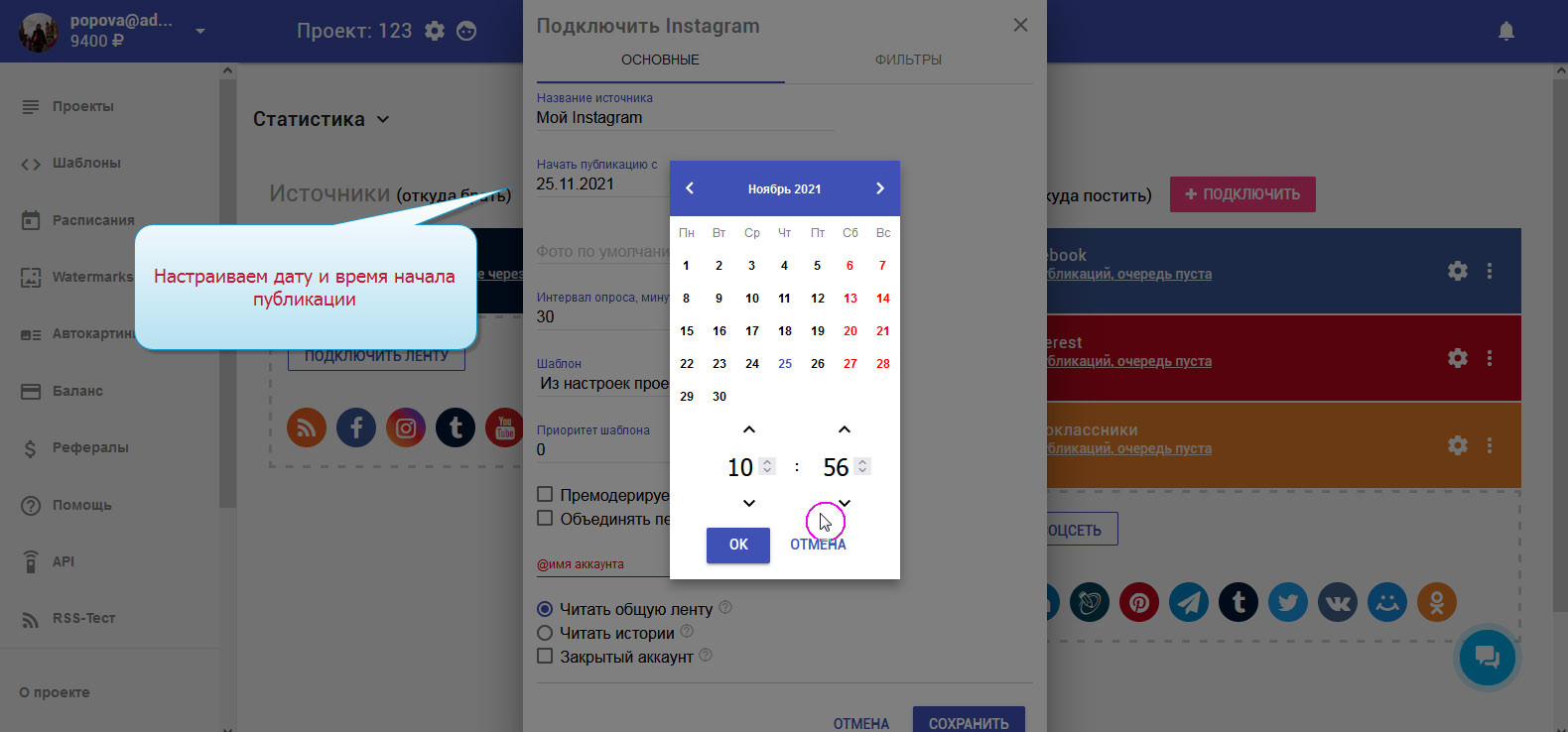4. Настраиваем параметры публикации. Например, установим дату и время начала публикаций.