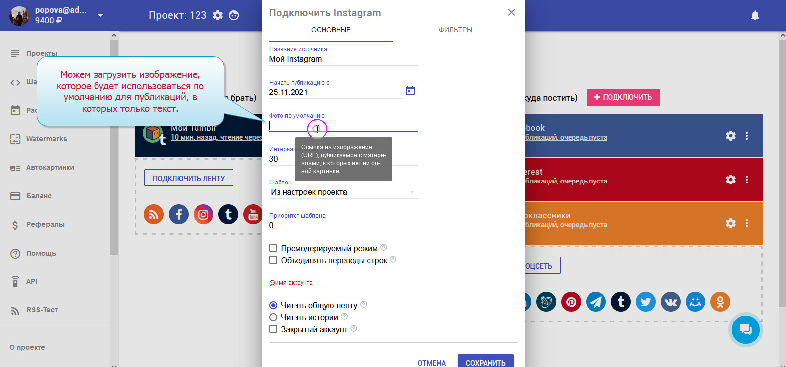 Чтобы записи публиковались в соцсетях автоматически, необходимо настроить Instagram-ленту.