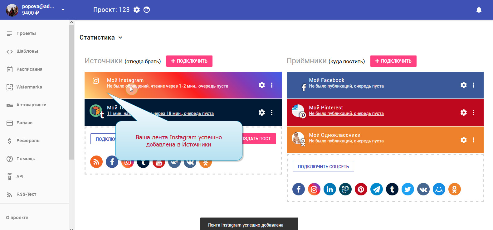 3. В колонке "Источники" нажимаем "ПОДКЛЮЧИТЬ ЛЕНТУ" или просто жмём значок Instagram.