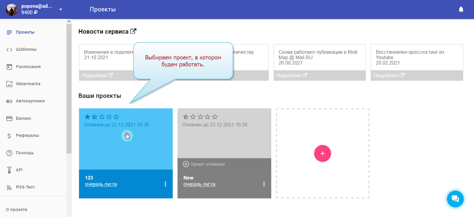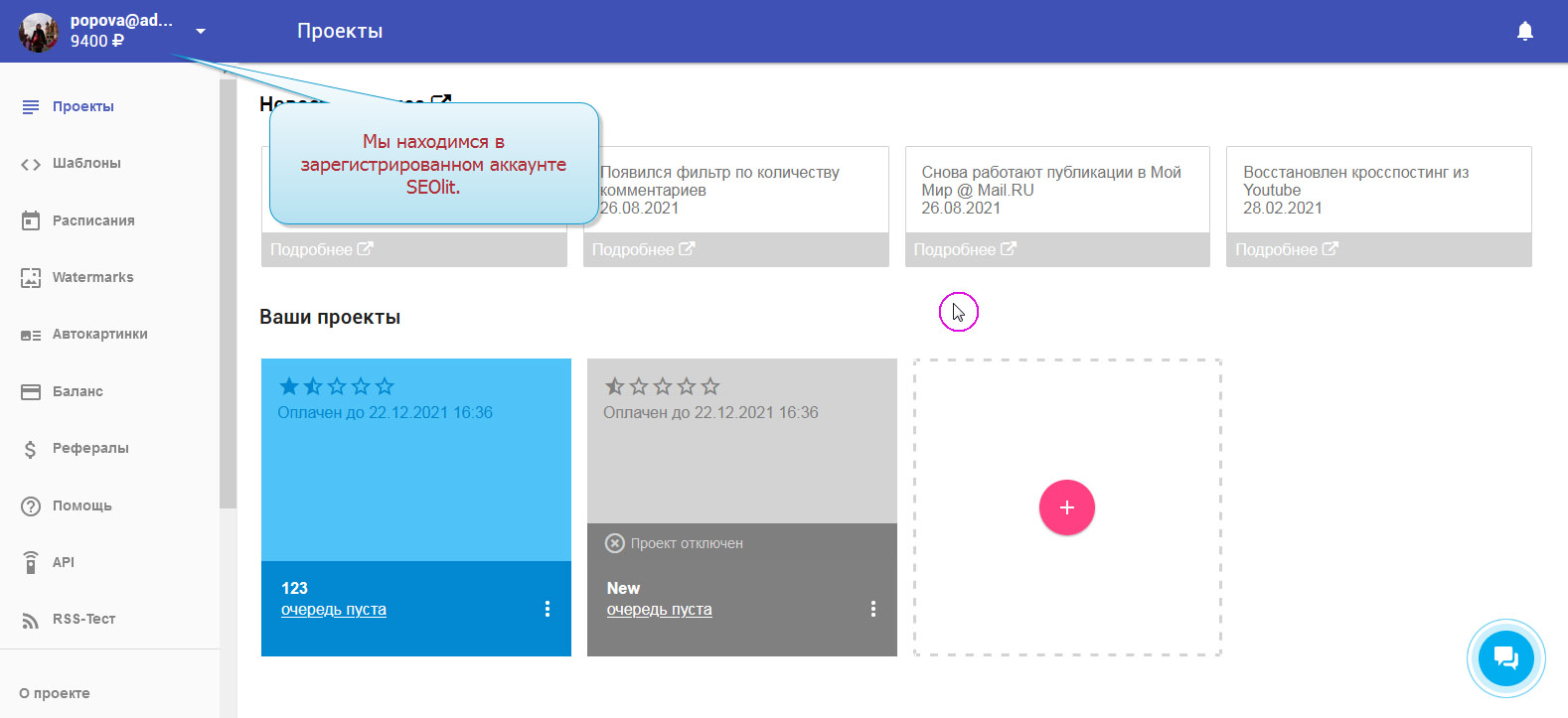 1. Вы вошли в свой профиль на Сеолите и находитесь на стадии выбора проекта.