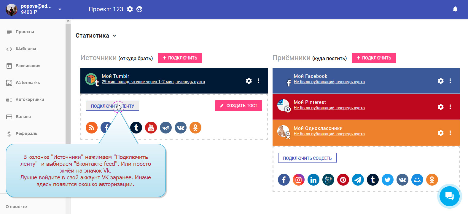 3. В колонке "Источники" нажимаем "ПОДКЛЮЧИТЬ ЛЕНТУ" или просто жмём на значок Vk. Зайдите заранее в свой аккаунт в Vk, чтобы не было необходимости проходить авторизацию на данном этапе.
