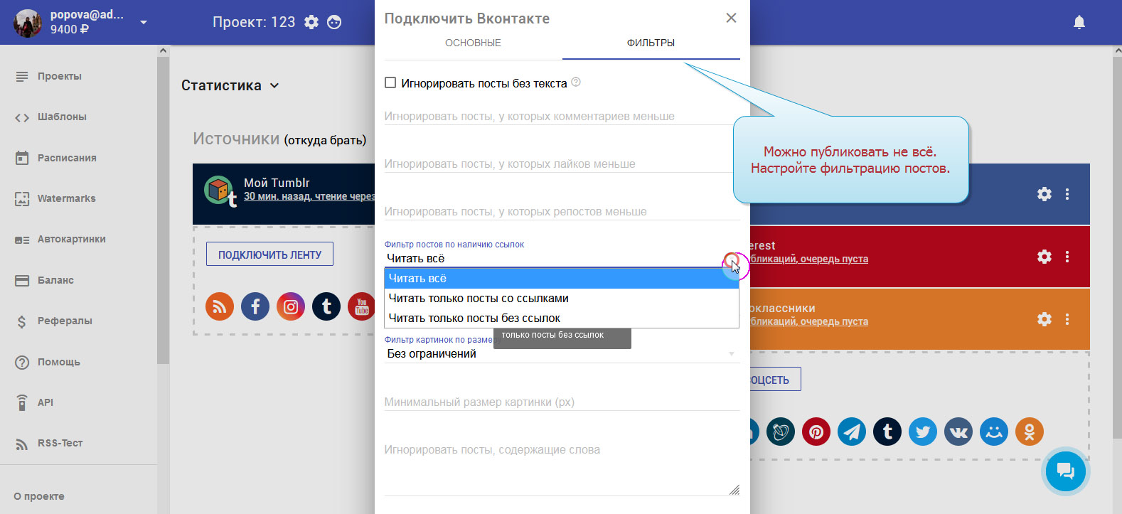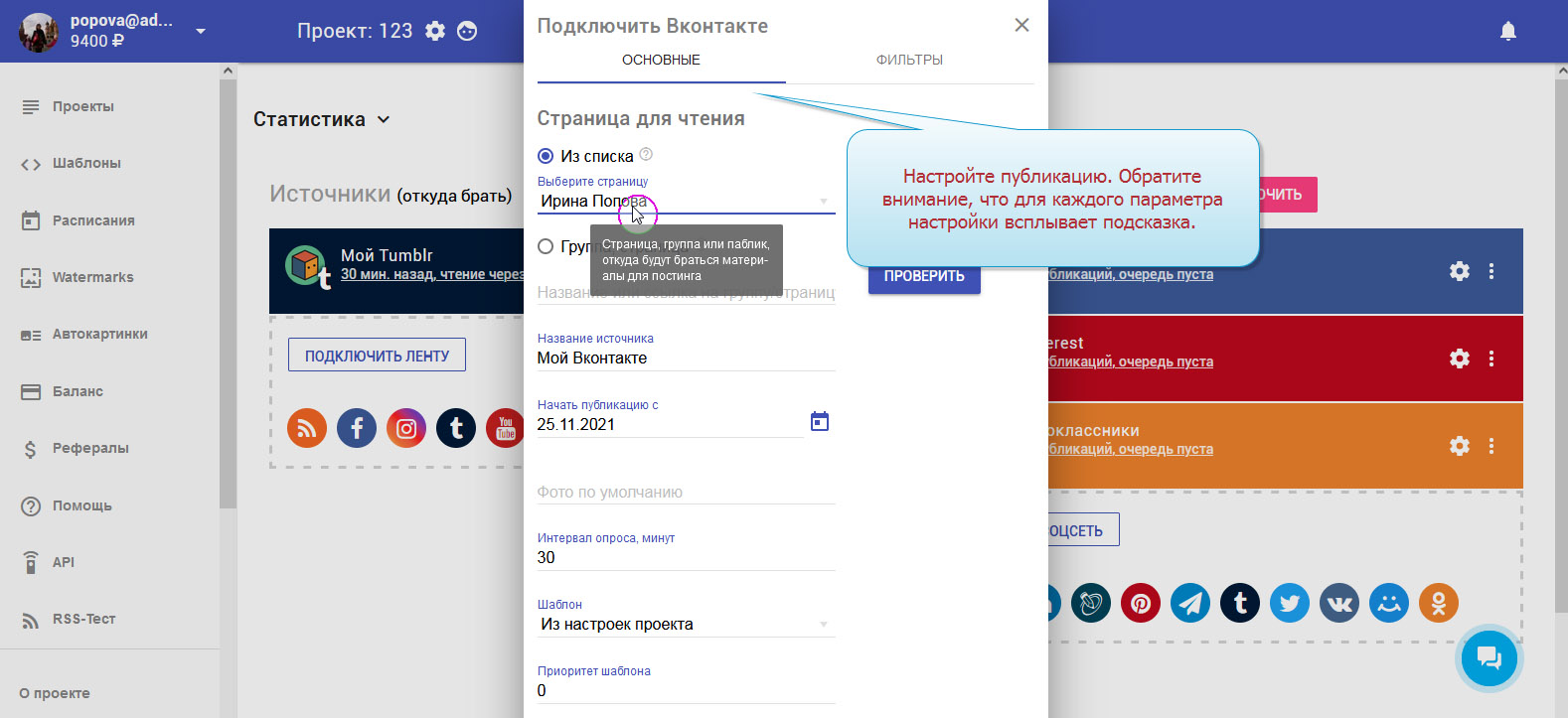 Чтобы записи публиковались в соцсетях автоматически, необходимо настроить ленту "ВКонтакте".
