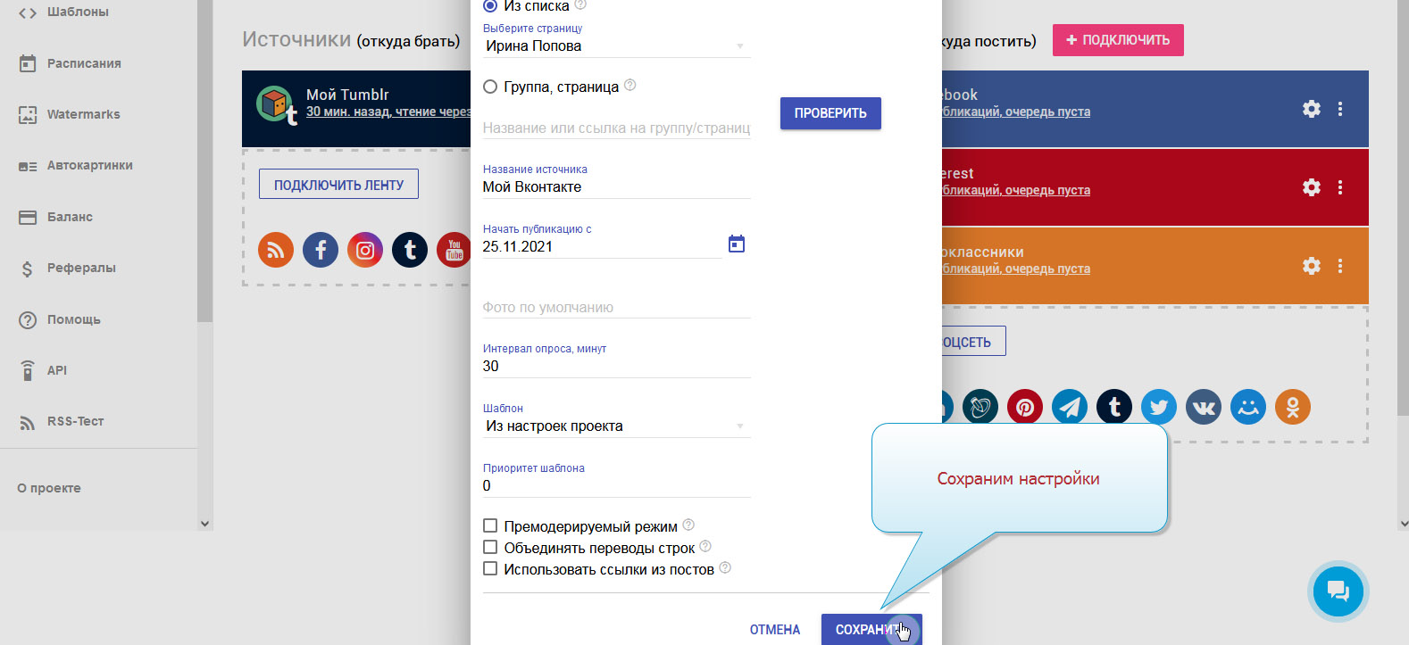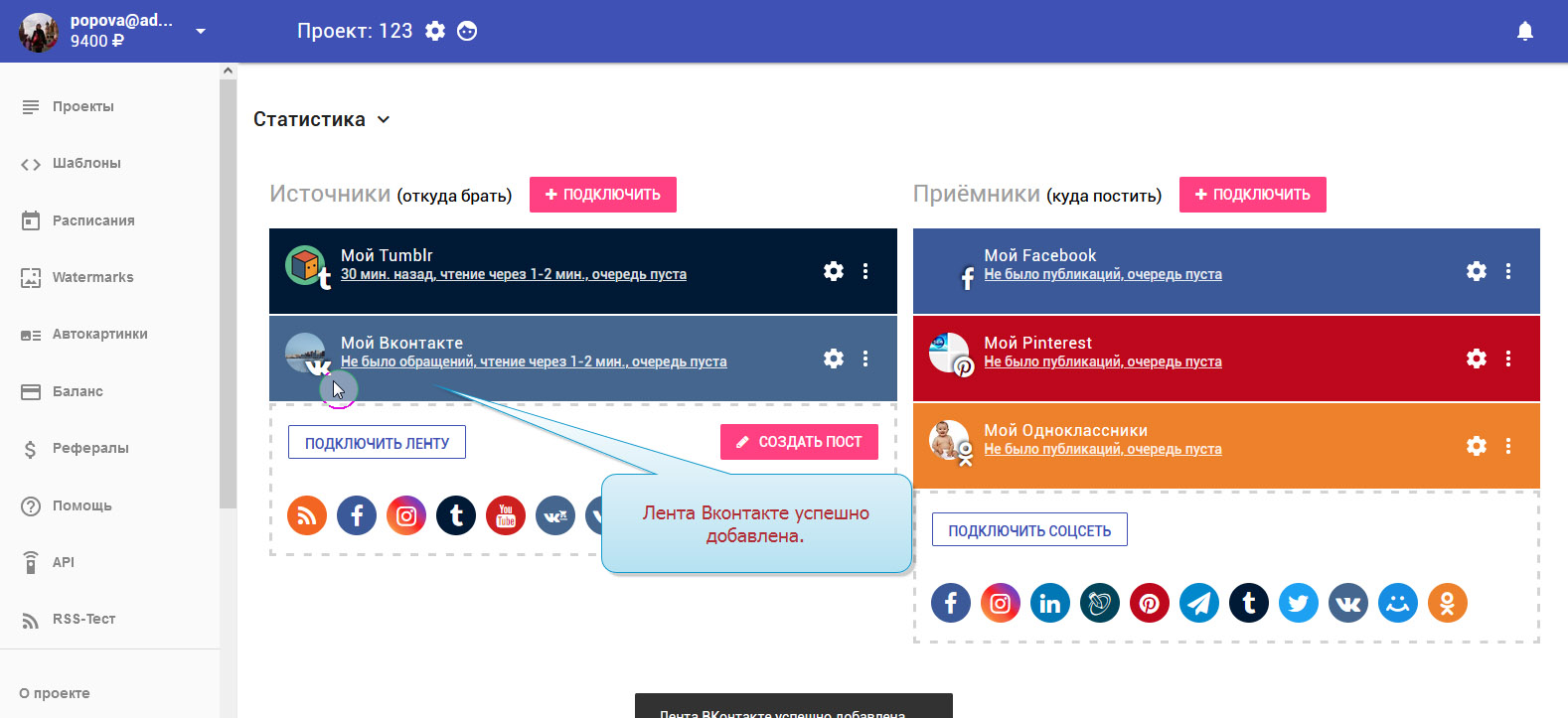 7. Лента "ВКонтакте" успешно добавлена и появилась в колонке "Источники".